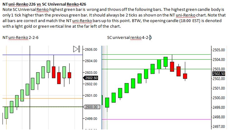 We are working on Renko bars now. When that version is released you can update to it and reevaluate. However, we are suspecting, there is not a problem and you are just looking for a certain behavior that is not supported in Sierra Chart. Rather Sierra Chart is showing more precise bars. Reference: https://www.sierrachart.com/Download.php?Folder=SupportBoard&download=13331 We do not want to comment on this, until we are done with the work. Sierra Chart Support - Engineering Level Your definitive source for support. Other responses are from users. Try to keep your questions brief and to the point. Be aware of support policy: https://www.sierrachart.com/index.php?l=PostingInformation.php#GeneralInformation For the most reliable, advanced, and zero cost futures order routing, *change* to the Teton service: Sierra Chart Teton Futures Order Routing Date Time Of Last Edit: 2017-10-10 07:43:44