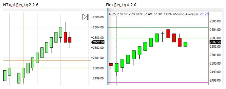 I noticed an error in the universal renko chart today on the ES. I am using the Universal Renko chart with a setting of 4-2-6 and I use the globex open (18:00 EST) as the open. Once an open is established, the candle bodies should shift up or down 2 ticks for every new candle for the rest of the day for the 4-2-6 setting. Today, I noticed it was correct for the first 9 bars and then it printed a bar that was only 1 tick higher which then throws the chart off for the rest of the day. The attached jpg (UR.jpg) shows this and compares it to a Ninjatrader uni-Renko chart which is correct. The Universal Renko chart matched the Ninjatrader chart until the 10th bar where the universal renko chart had the aforementioned glitch. I also looked at the Flex Renko 4-2-0 chart and it had a glitch as well, but of a different nature (see attached jpg FR.jpg). I use a Universal Renko chart for trading and am considering switching from NinjaTrader to Infinity Futures, but I need this chart to be correct and reliable before I can make this switch. I'd also like to see the new bar fill from the offset immediately when it forms as I mentioned in my previous support request. 1. Is there any chance the universal renko chart can be debugged and made reliable any time in the near future? Or, if you believe the universal renko chart is not in error, can you create a version that matches the NinjaTrader uni-Renko chart? I'm willing to help if necessary. thanks in advance. |