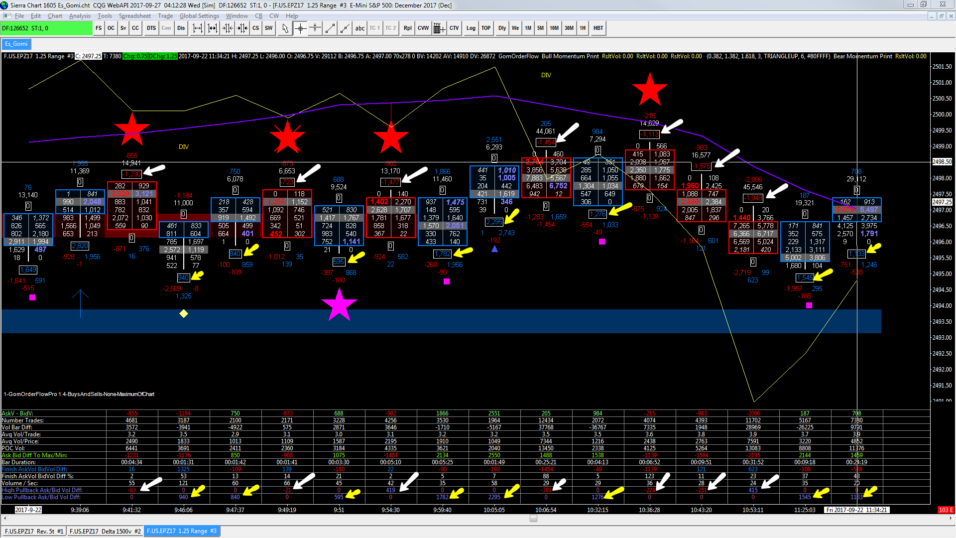 I am using GomOrderFlowPro from gomicators.com as footprint, and one data this Study provide is High COT that is the same data as "High Pullback Ask Volume and Bid Volume Diff" for "Numbers Bars Calculated Values" study from SC. Problem is that this values are not equal when it have to be. www_screencast_com/t/gSJakHJxPXB Please review attach image (see Link above) as an example of what i am trying to explain... I use Yellow Arrows to signal when "Low COT" from GomOrderFlowPro is equal to "Low Pullback Ask Volume and Bid Volume Diff" from Numbers Bars Calculated Values SC Study. I use White Arrows to signal when "High COT" from GomOrderFlowPro is not equal to (When is has to be) "High Pullback Ask Volume and Bid Volume Diff" from Numbers Bars Calculated Values SC Study. Could you help me to review and fix calculation for High Pullback Ask Volume and Bid Volume Diff, please ? Thanks a lot for your help. Kind regards. |