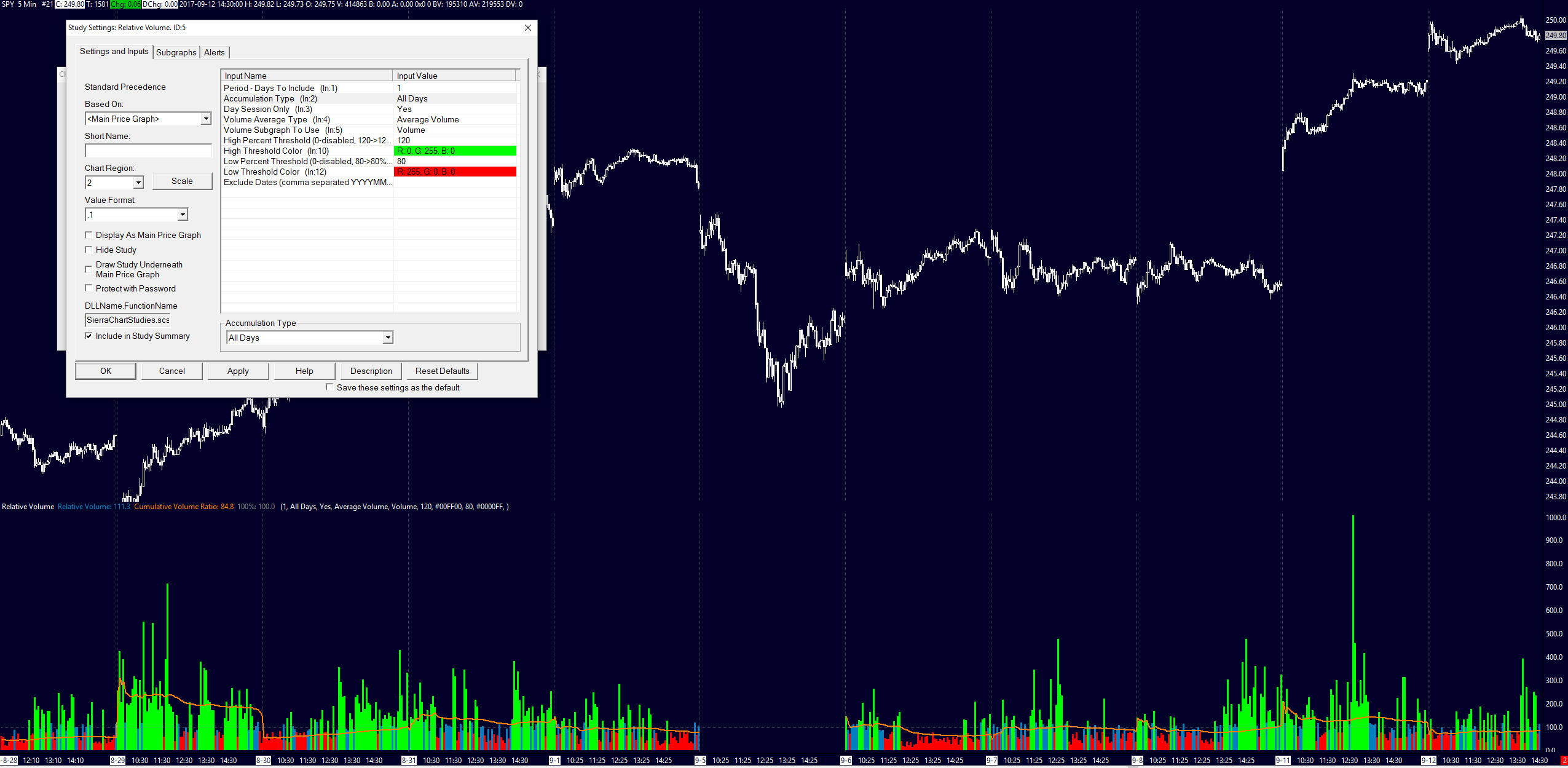 The Relative volume study does not calculate correctly after holiday period. See image attached- Based on a 1 day period there is no data for 9-5, because 9-4 was a holiday. Can you please add an input to the study so it skips holiday periods, similar to that of the rolling VWAP study "Minimum Required Time Period as Percent for Skip Days: This Input only applies when the Time Period Type is set to Days - Trading Days or Days - 24 Hour Period . This study employs special logic when looking back at the previous days, to determine if there is sufficient data. If there is insufficient data, it looks back to the period before the first period it originally referenced. This is very useful for holidays and Sunday trading. There is no need to remove data from periods where there is insufficient data. You can control the functioning of this period skipping feature with this Input. For example, if you want there to be at least 50% or more of the bars needed for 1 day period, then set this Input to 50" Date Time Of Last Edit: 2017-09-29 23:50:34