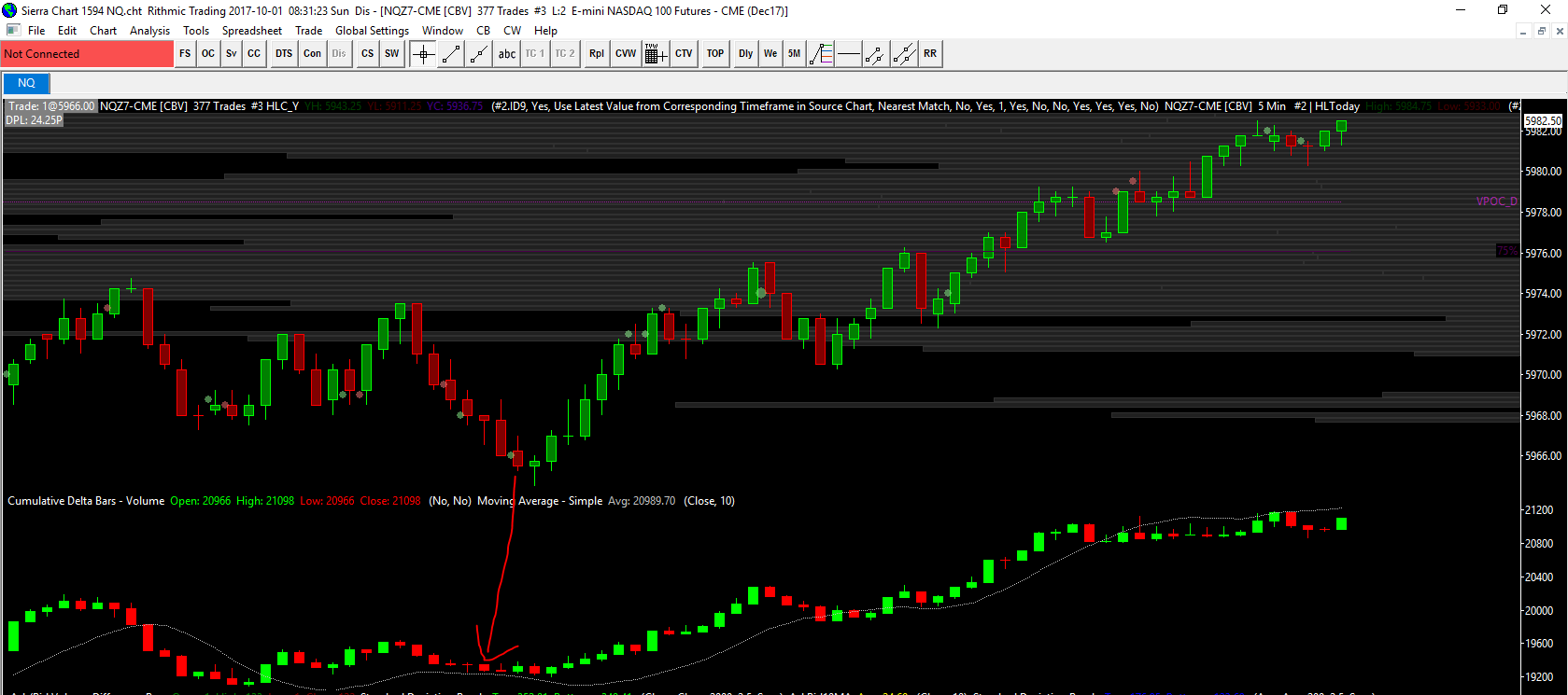 Hi, I am using Cum Delta - Volume as a secondary indicator and I also plot a 10 Mov Avg of this Cum Delta on the secondary indicator. However, I have found that the Cum Delta vs MA relationship will differ depending on the zoom or scroll of the chart. In other words, at exactly the same time, the Cumulative Delta may be above or below the MA dependent on the zoom or scroll of the chart. A lot of my decisions are based on accurate visual display of this relationship. Please see attached 2 examples as well as my settings. I also tried a setting of 'Independent' on my 10 MA Scale Range but the results stay the same. If we look at the price of a chart (tick chart) and its relationship with a MA, the relationship is constant. It does not change based on scroll or zoom. How do I fix this issue? |