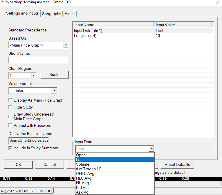 This is controlled through the Input Data input with studies: http://www.sierrachart.com/index.php?page=doc/StudiesReference_CommonStudyInputs.php#InputData Sierra Chart Support - Engineering Level Your definitive source for support. Other responses are from users. Try to keep your questions brief and to the point. Be aware of support policy: https://www.sierrachart.com/index.php?l=PostingInformation.php#GeneralInformation For the most reliable, advanced, and zero cost futures order routing, *change* to the Teton service: Sierra Chart Teton Futures Order Routing |