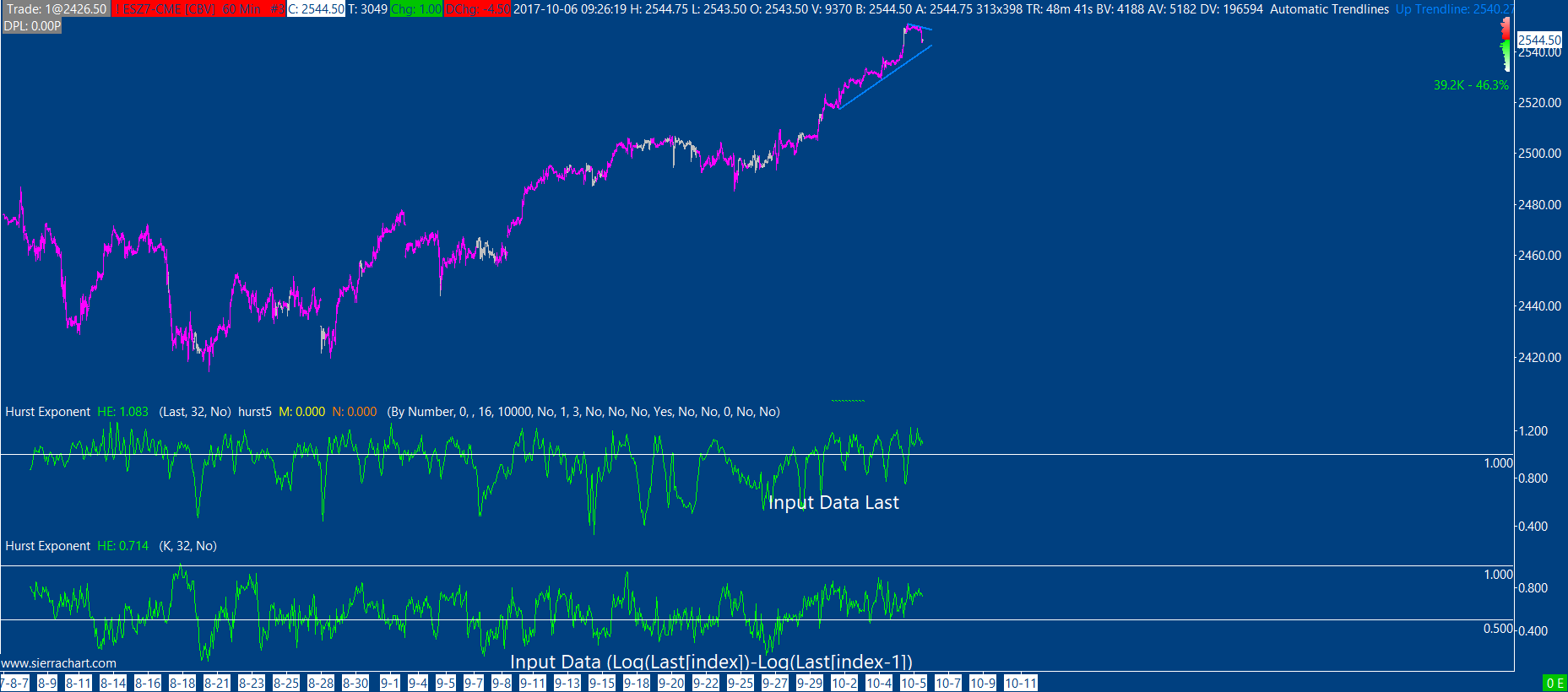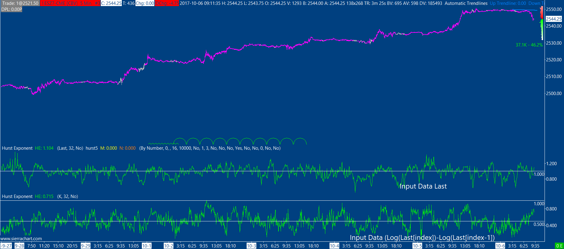 Your input data series allow you to select OHLC data which is fine . However the Hurst function is based on mean adjusted return data where the In_X is an array of normalized returns. By doing this the function becomes bounded by 0<H<1. This is a a picture shows the difference with current calculation verse using return data and address why the current function is has values over 1 and is not centered around .5. http://www.sierrachart.com/image.php?Image=1507295497478.png higher timeframe and better picture. http://www.sierrachart.com/image.php?Image=1507296382725.png Date Time Of Last Edit: 2017-10-06 13:27:43