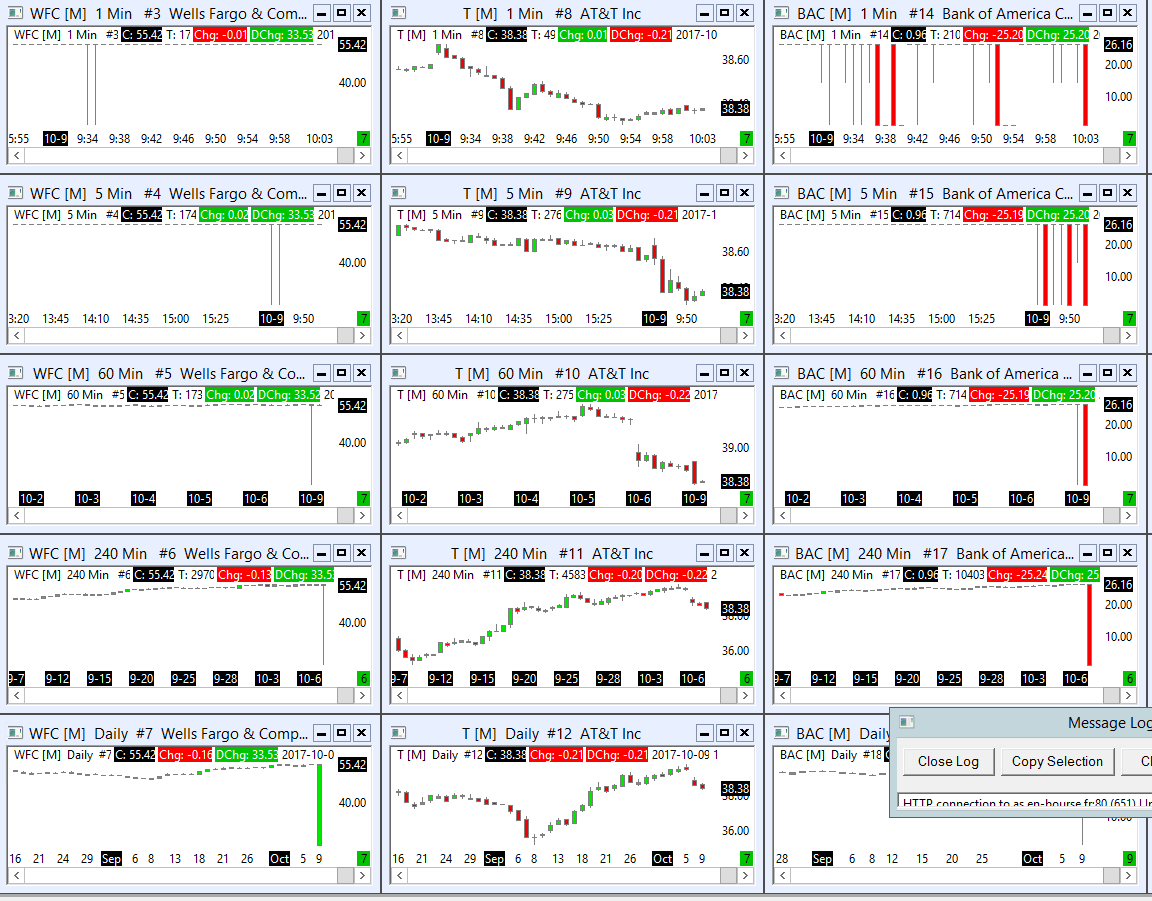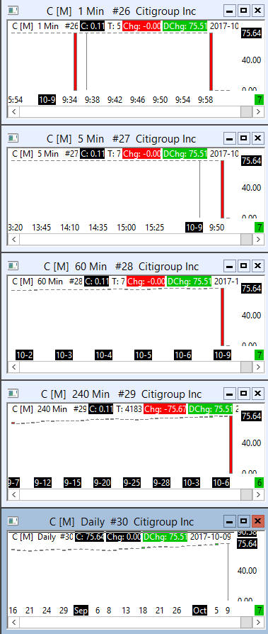 Hi, Today I realize there is a problem with some US charts from the sierra chart feed. This include : Citigroup, Bank of America, Wells&Fargo, ... The bug is going on at the moment, in M1, M5, H1, H4, D1. Here are 2 screenshots. Thanks for your help, Regards, |
