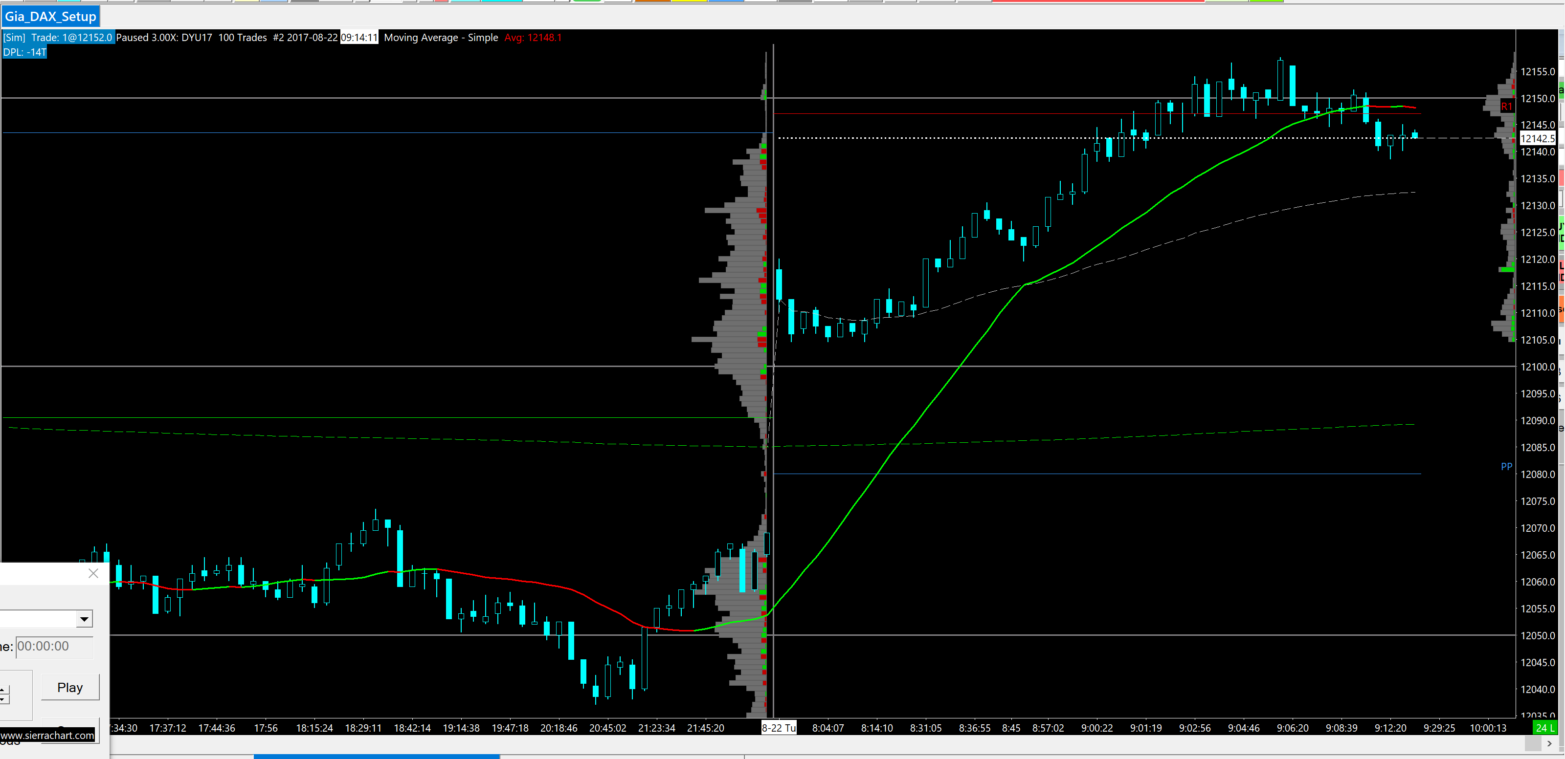 So the moving average will start fresh every day. I want the moving average to start calculating values from the first price of the day when ther's a gap up in the opening and not to continue from yesterday's price like the SMA in my cap. http://www.sierrachart.com/image.php?Image=1507833181498.png |