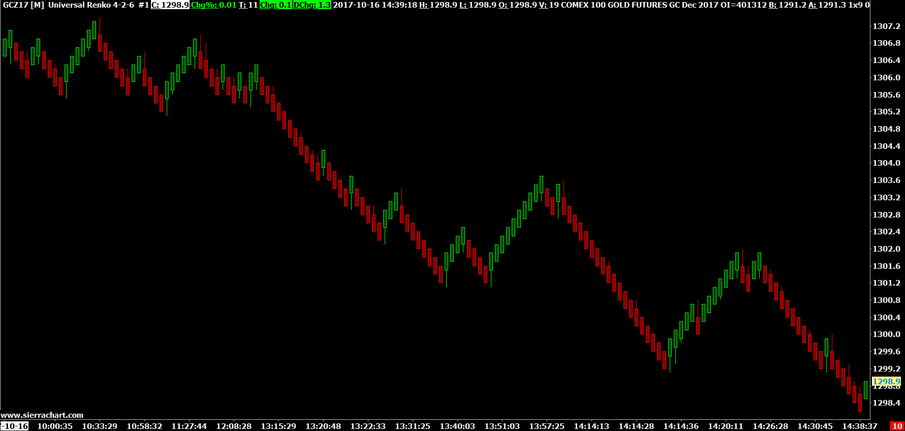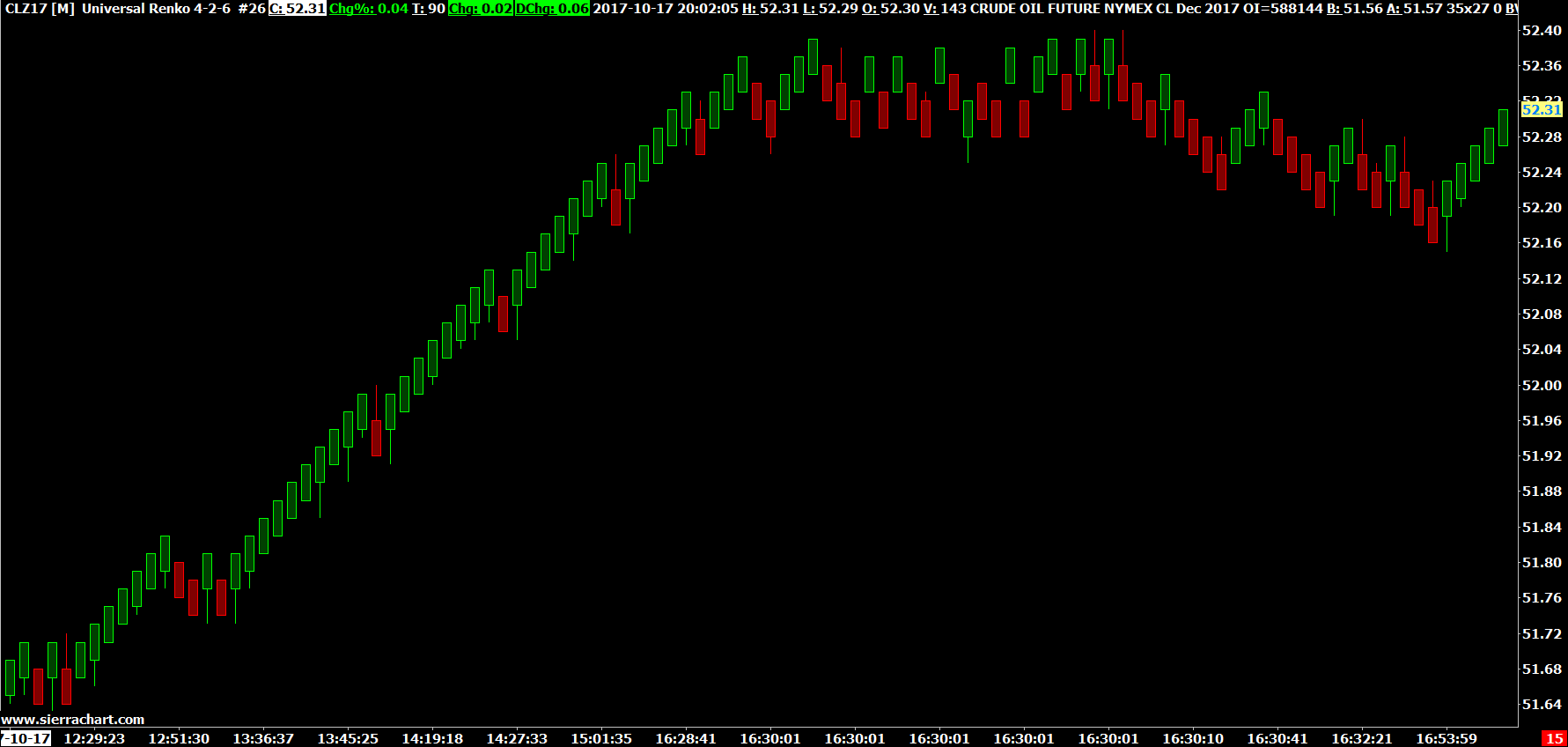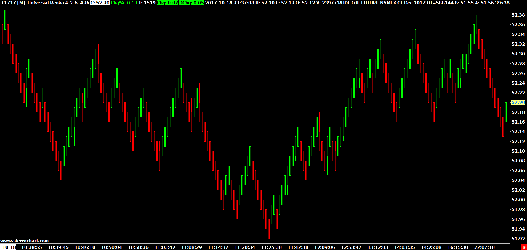 This is what we see for CLZ17 using the same Universal Renko bar settings: http://www.sierrachart.com/image.php?Image=1508461976478.png Not like what you showed in post # 5. The thing is, the newer version does not change anything which would cause any significant difference in this case. Set Sierra Chart to a Tick by Tick Data Configuration: Tick by Tick Data Configuration Although even with 1 second data we did not see what you showed either. Sierra Chart Support - Engineering Level Your definitive source for support. Other responses are from users. Try to keep your questions brief and to the point. Be aware of support policy: https://www.sierrachart.com/index.php?l=PostingInformation.php#GeneralInformation For the most reliable, advanced, and zero cost futures order routing, *change* to the Teton service: Sierra Chart Teton Futures Order Routing Date Time Of Last Edit: 2017-10-20 01:44:26