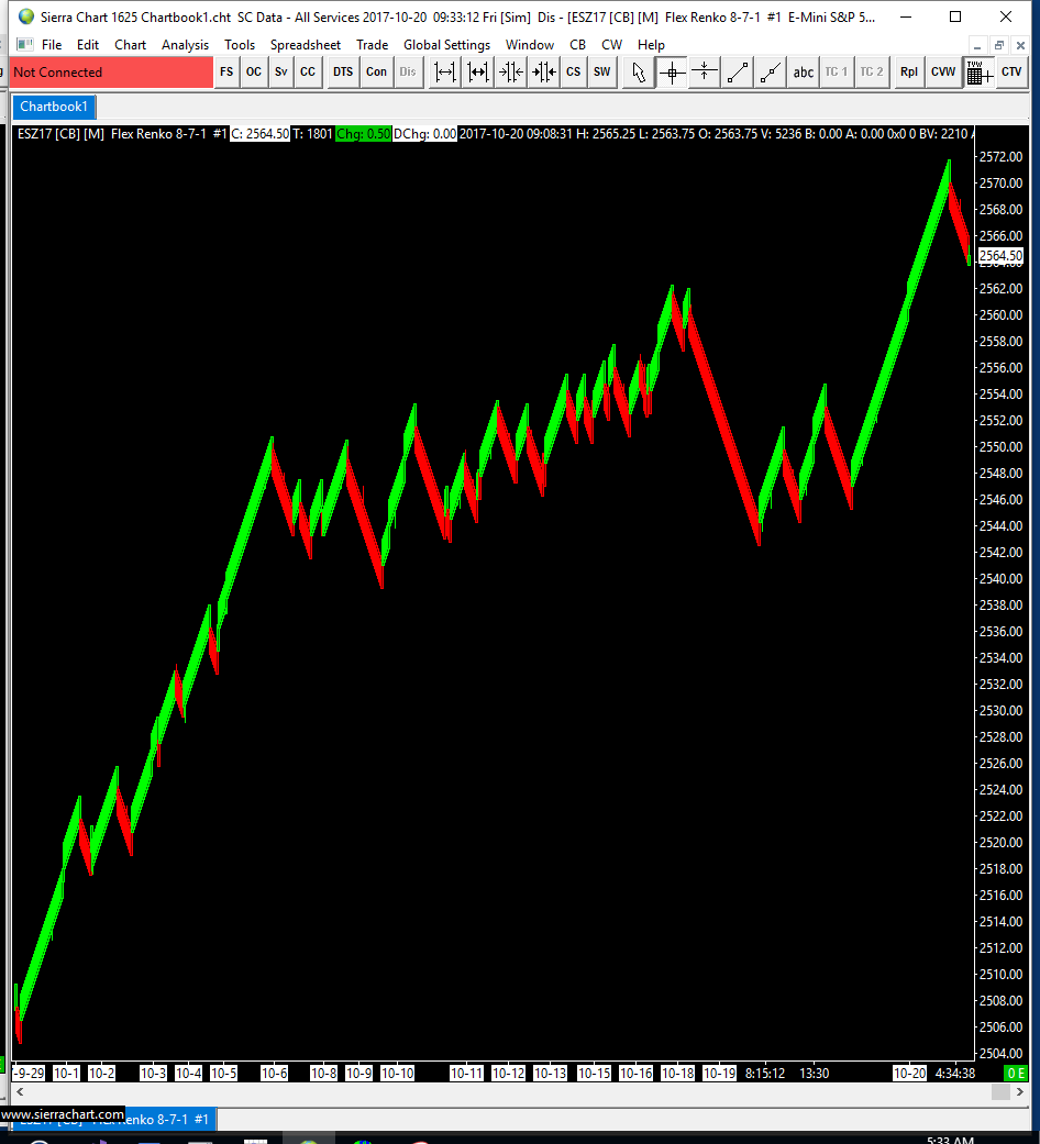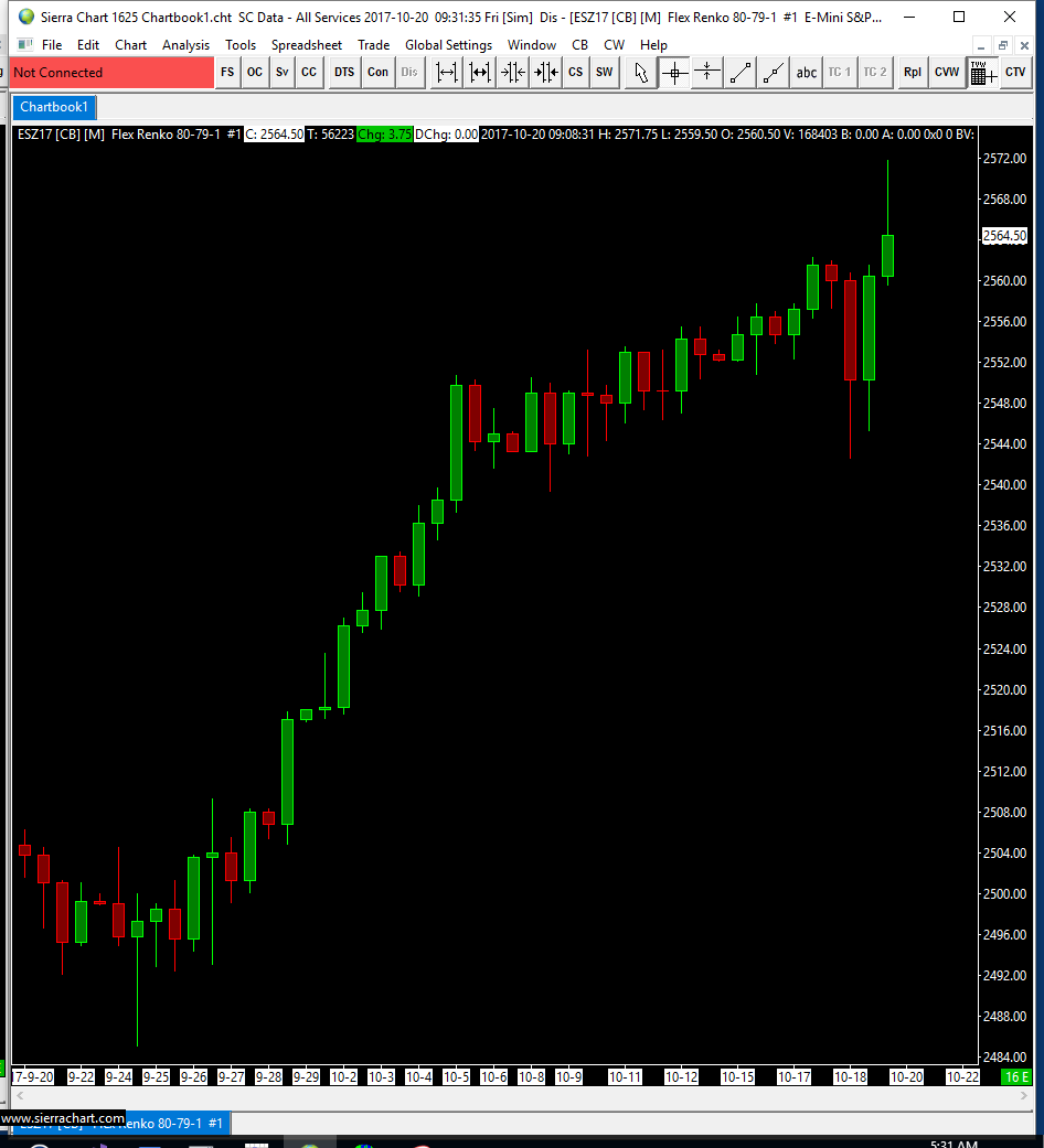 You need to disable New Bar at Session Start in Chart >> Chart Settings. We are sure there is not a problem with Flex Renko bars in 1625. We are not here to make Renko bars work exactly like they did in the prior version. Do not count on that. We are here to properly implement Renko bars according to specifications and according to how Sierra Chart normally creates chart bars. Please understand that. They are properly implemented at this time. That we are certain of. If there is an issue, the charts you provided do not provide any evidence of that because we cannot use a comparison to what existed previously as a basis. The basis must be an explanation of the underlying tick by tick data, in relation to the documentation and what you then see with the current version for Flex Renko bars. The previous implementation of Renko bars had at least one issue, and was not a proper implementation. It was done by one of our other programmers who is no longer with us and who did not implement these consistent with other chart bars in Sierra Chart, and the code was not of the best quality to put it kindly. It had to be rewritten. Sierra Chart Support - Engineering Level Your definitive source for support. Other responses are from users. Try to keep your questions brief and to the point. Be aware of support policy: https://www.sierrachart.com/index.php?l=PostingInformation.php#GeneralInformation For the most reliable, advanced, and zero cost futures order routing, *change* to the Teton service: Sierra Chart Teton Futures Order Routing Date Time Of Last Edit: 2017-10-20 19:34:58