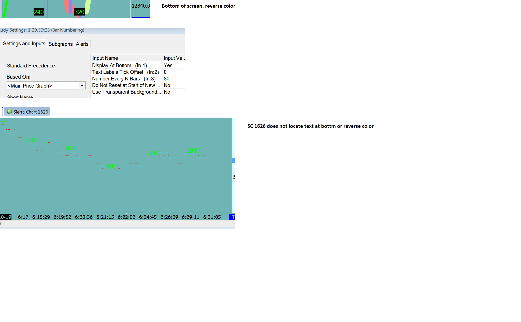 1. The Bar Numbering study has been improved upon performance wise, and the ability to locate the numbers at the bottom of the chart will be supported in the next release. 2. We have 100% discontinued all support for the old Renko studies. Although they are still listed in Analysis >> Studies >> Add Custom Study. Just make sure the Graph Draw Type setting for them is set to the one of the "Renko" type types and they should still work as previously. Sierra Chart Support - Engineering Level Your definitive source for support. Other responses are from users. Try to keep your questions brief and to the point. Be aware of support policy: https://www.sierrachart.com/index.php?l=PostingInformation.php#GeneralInformation For the most reliable, advanced, and zero cost futures order routing, *change* to the Teton service: Sierra Chart Teton Futures Order Routing Date Time Of Last Edit: 2017-11-06 07:17:08