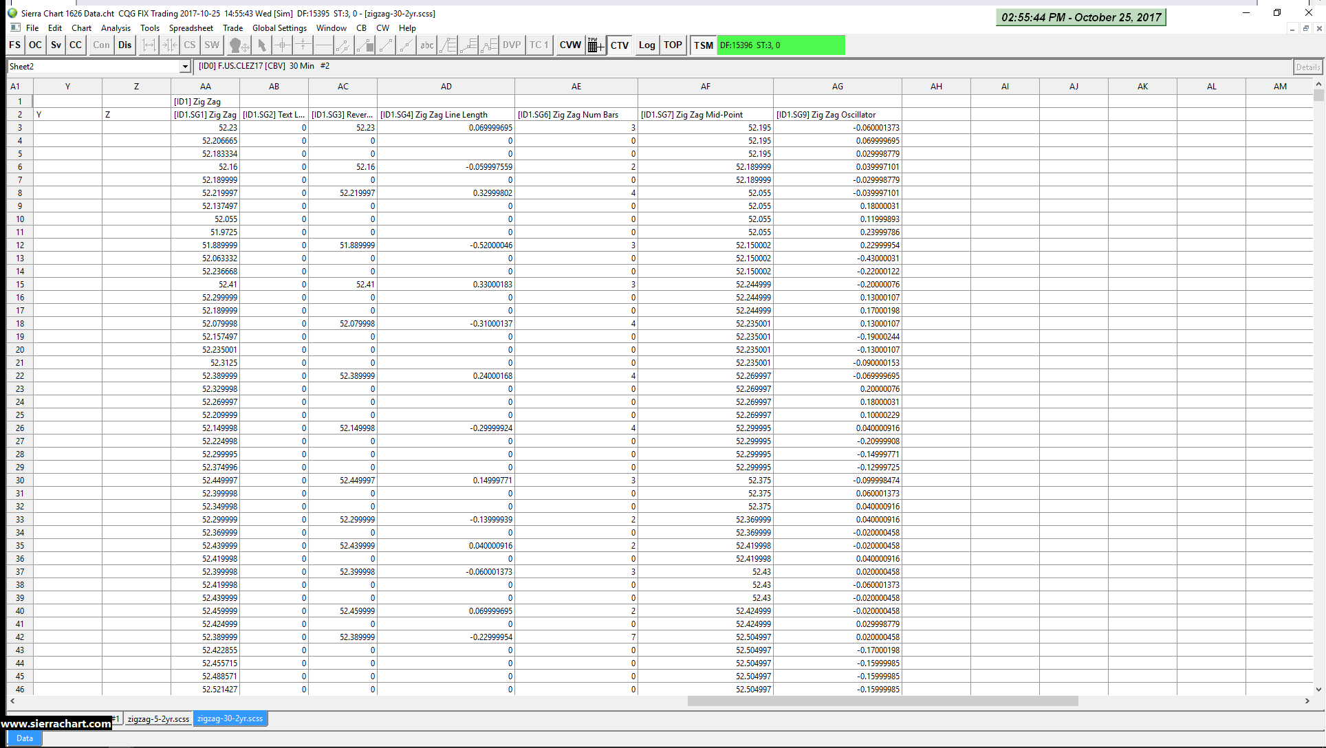 I have set up 2 different charts of CL, one with a 5 minute time frame and the other with a 30 minute time frame. I have put a zigzag study on both with only the lines and the length of the line being displayed. I then set up 2 different spreadsheets one for each chart and put a spreadsheet study on both. The settings on both spreadsheets studies are identical. The data on the 5 minute spreadsheet shows all the data from the chart, the data on the 30 minute spreadsheet does not show the length of the zigzag line which is the one piece of data that I am looking for. I have deleted the 30 minute spreadsheet and set it up several time. I have tried reloading and recalculating the chart several times and the data for the length of the zigzag line does not show up on that spreadsheet like it does on the 5 minute spreadsheet.
