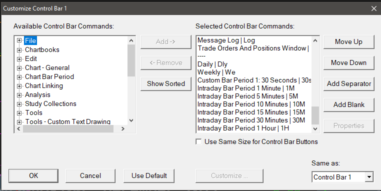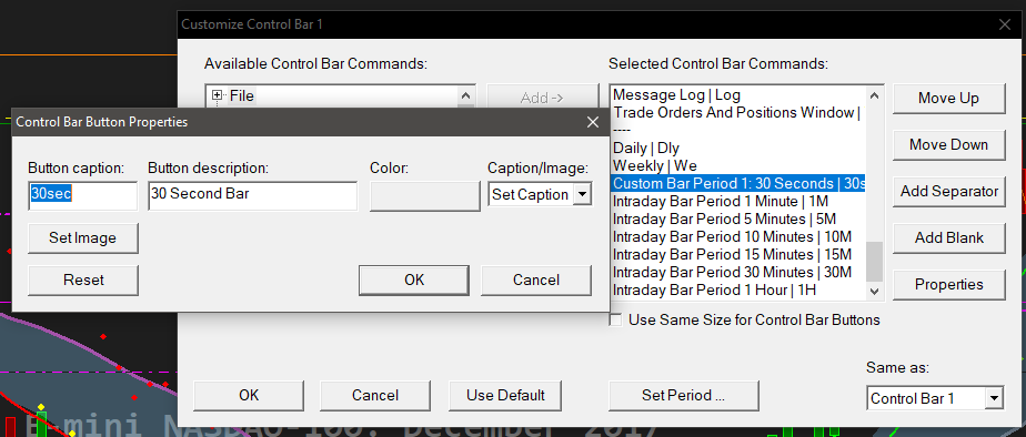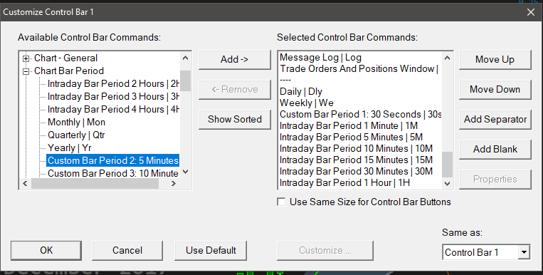 You cannot customize the menu but you can add your own custom Control Bar buttons for time periods: Control Bar: Custom Buttons for Intraday Chart Bar Period That is very good of you to provide those screenshots in post #2, but Sierra Chart already has complete documentation for this. Sierra Chart Support - Engineering Level Your definitive source for support. Other responses are from users. Try to keep your questions brief and to the point. Be aware of support policy: https://www.sierrachart.com/index.php?l=PostingInformation.php#GeneralInformation For the most reliable, advanced, and zero cost futures order routing, *change* to the Teton service: Sierra Chart Teton Futures Order Routing |