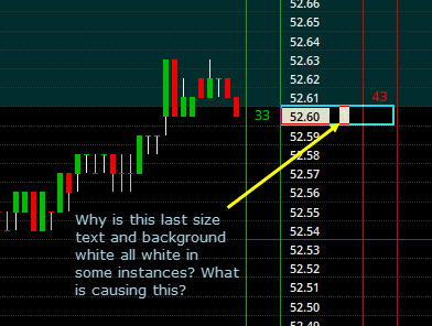 In Graphic Settings - Global, I set the colors for the Trader DOM. I had text and background different colors so I could see the text. However, in the last size column, I noticed that in some instances, both the last size text and background are both white so I could not see the text. Any idea what is causing this? I have attached a screenshot to show the issue. Thanks. |