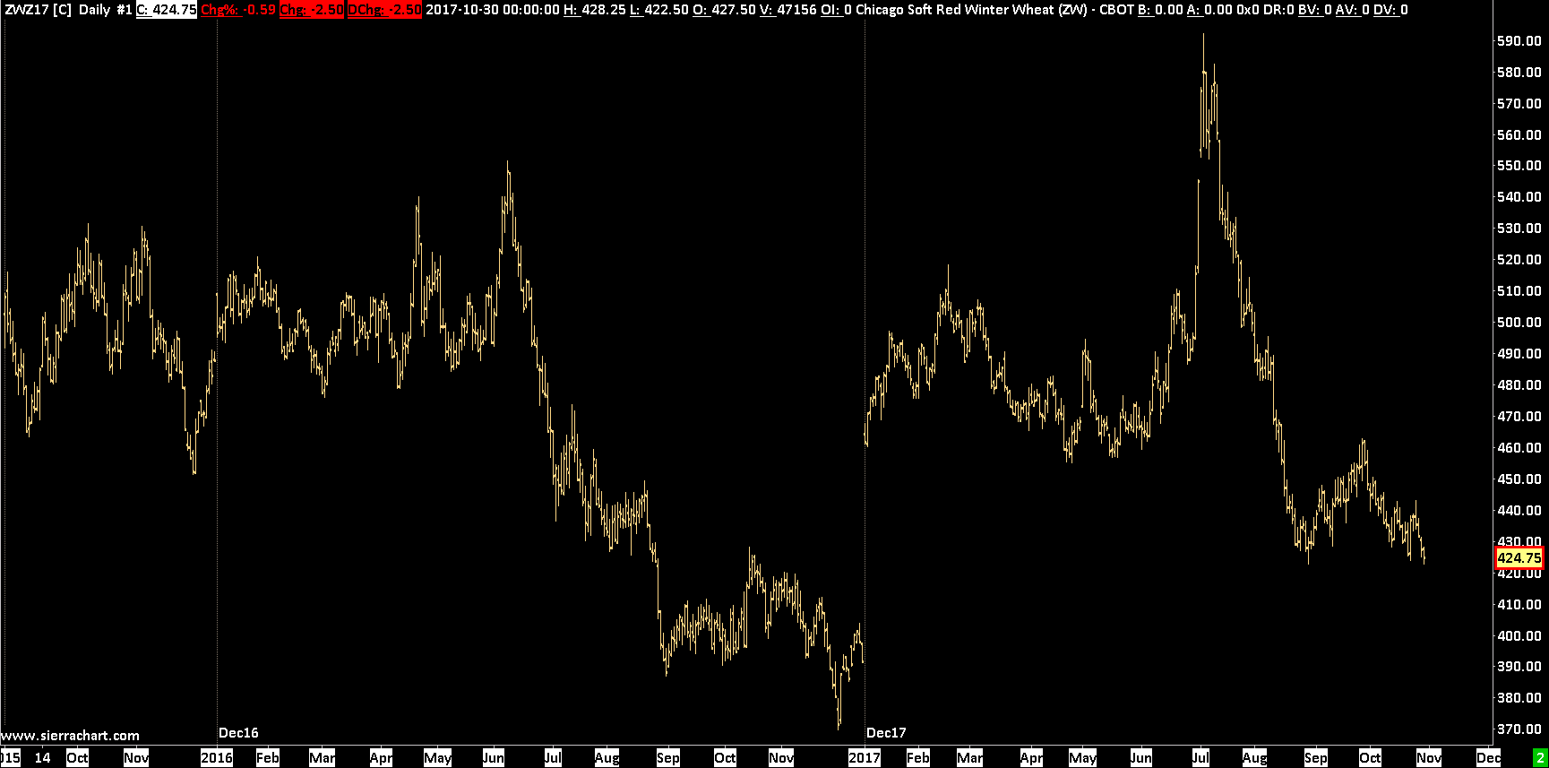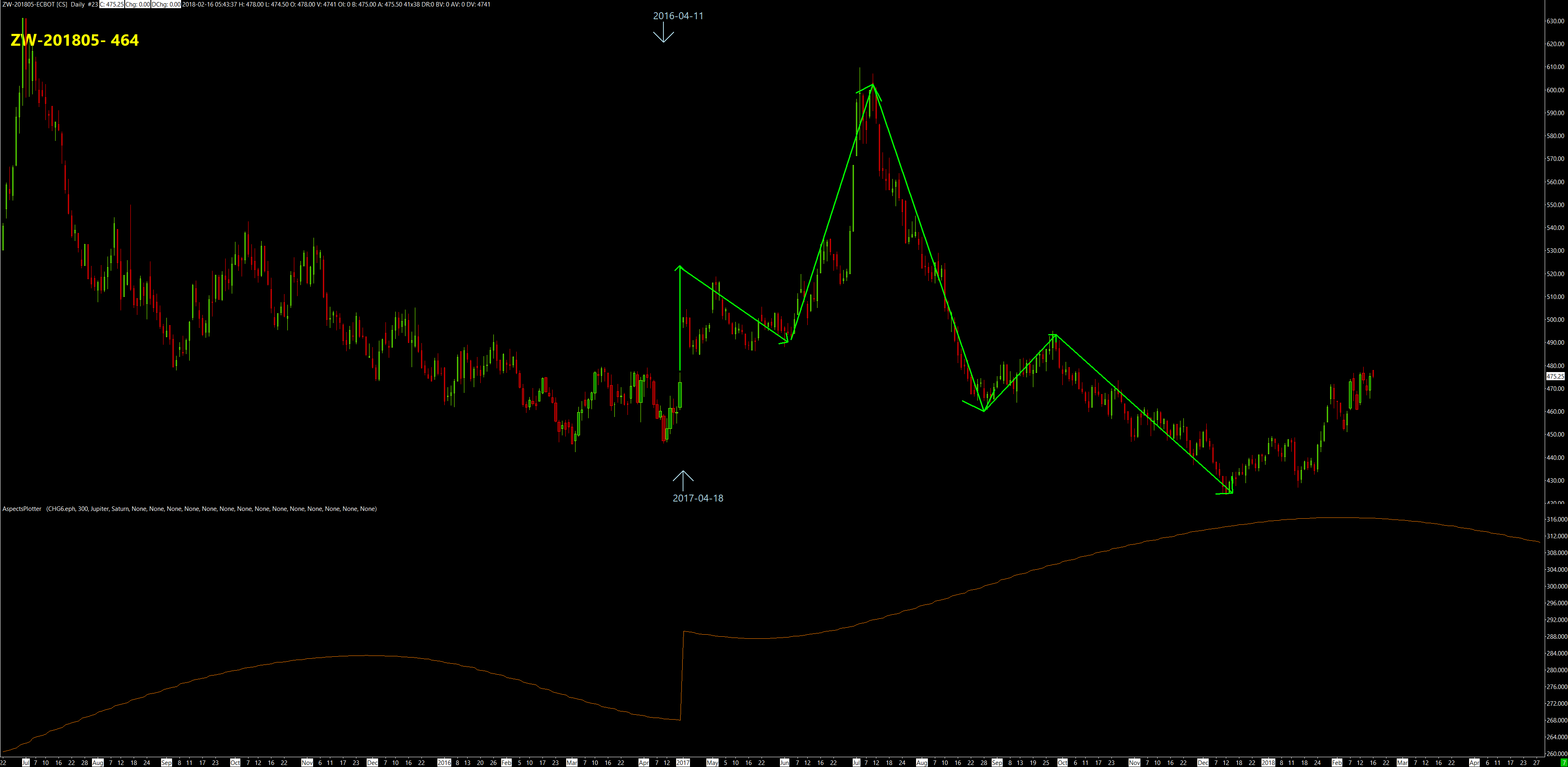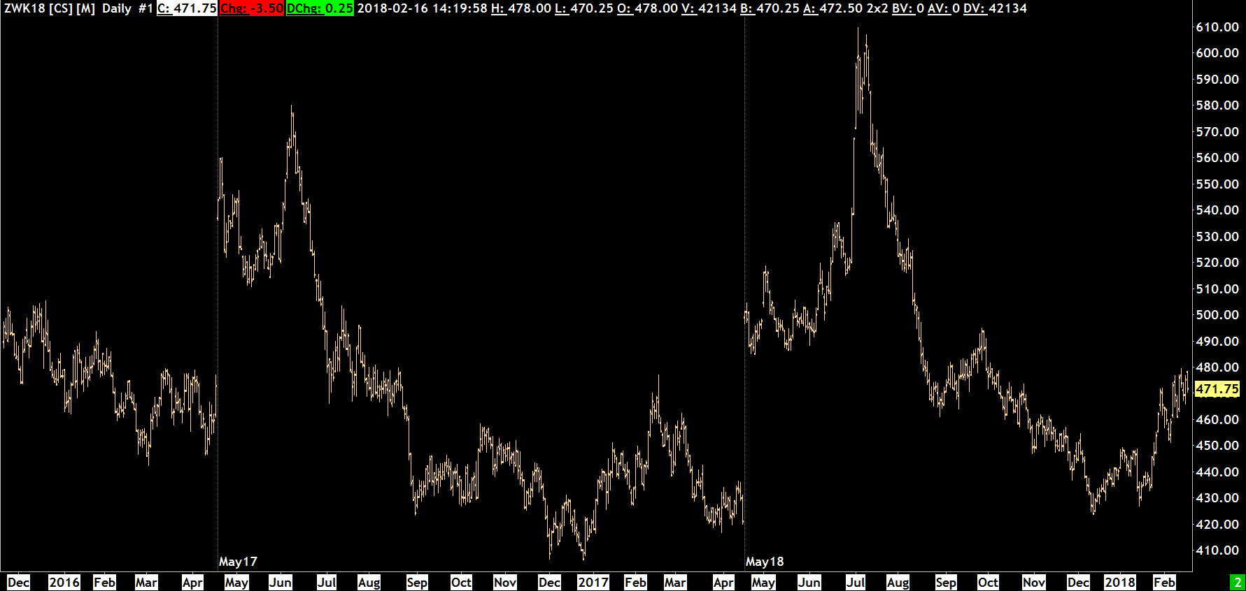 | Hi Sierra, Can you please fix the implementation of this? It is crucial for astrological analysis. Please see attached in wheat. The May Wheat 2016 expired in mid-April 2016. The day after this 2016 contract expires, i.e. still in May 2016, the 2017 contract data is supposed to be show. I appreciate that the volume will be thin for the 2017 contract in May 2016 this is what is required for Astrological Analysis. With the current implementation, there is a year of missing data - making Gann analysis impossible. Please see the date markers I have put on the chart. http://www.sierrachart.com/image.php?Image=1518778175109.png With thanks, Michel Date Time Of Last Edit: 2018-02-16 10:58:55  |