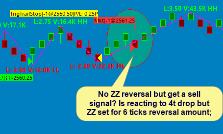 Observed Problem; getting a trade signal on a 4 tick reversal instead of 6 ticks; (fake signal off ZZ study) with Auto Trade System bar based Backtest & Auto Trade System Replay Backtest; Version 1625 or 1629 Chart Renko 2 tick with wicks; setups in attached pictures; Spreadsheet for automated trading set to use the ZigZag SG4 as one of the triggers; when SG4 <> 0 on row 3 then assume a reversal or depending on the setting row 4; What I am seeing is two versions; #1) row 3 is monitoring a reversal; the reversal is triggered to row 4 {4 ticks} (creating a trade), then when the reversal fails SG4 sets row 3 back to the value being monitored creating a false signal; #2) row 3 is monitoring the reversal signal, the at 4 ticks (sometimes) we get a reversal and the value moves to row 4, still a false signal; This is not occurring all the time; maybe 15% of the trades I am looking at; Zig Zag Setup; setup attached; High/Low; Calc mode 2 or 3; reversal 1.5 (6 ticks ESZ7); have used both modes 2 & 3; same result; Reversal amount = 1.5 points Number of bars required for reversal - 1 bar selected; I have used calc on bar close (in28) = yes & no; same results Sheet setup: attached; Signal on bar close = YES (I have used NO also, same result) I have tried (In 50) Strict signal on bar close evaluation; same result but varies SG4 row 3 like #1 & #2 mentioned above; Can you point me in a direction here? Could there be a misconception when using Renko bars? I can't finish testing the system until I can get consistent entry signals; examples attached also; Thanks. St. |