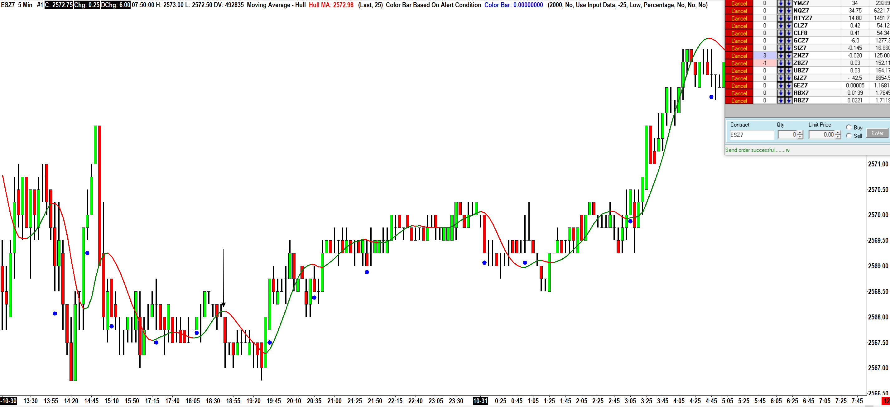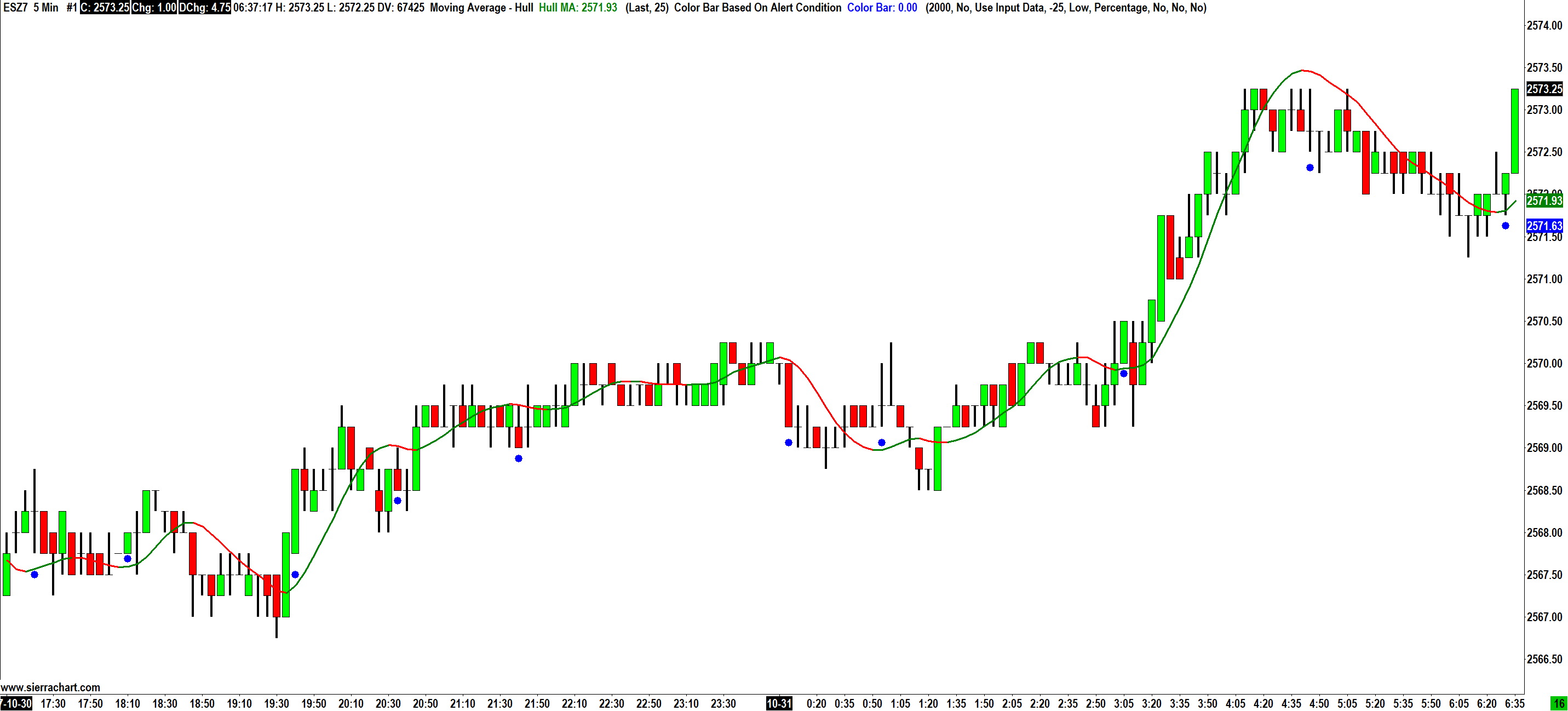 I am using this formula: =OR(AND(ID1.SG1[0] > ID1.SG1[-1],ID1.SG1[-1] < ID1.SG1[-2]),AND(ID1.SG1[0] < ID1.SG1[-1],ID1.SG1[-1] > ID1.SG1[-2])) Which is derived from this page (I added ID1. in front of all instances of SG1, that was the only change): Study/Chart Alerts And Scanning: Alert Formula Examples I also added the Auto-Coloring Based on Slope. In the image linked, you can see places where the slope changes and therefore the line changes color, but I don't get the blue point which is my output for the Color Bar Based On Alert Condition Study: http://www.sierrachart.com/image.php?Image=1509449840181.png I am looking for a way to get a visual notification in the form of an arrow or point whenever the slope changes (not just the line coloring). Any ideas? |