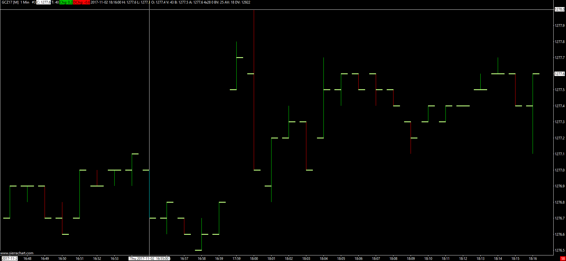 A 1 minute chart has the first bar at the 18:00 open showing as closing at 17:59 We need to understand how you are coming to this conclusion.Scroll the chart to this time and increase the spacing between the chart bars to make it more clear. Provide an image of the chart or Trade DOM, by following these instructions: https://www.sierrachart.com/index.php?page=doc/PostingInformation.php#Image Sierra Chart Support - Engineering Level Your definitive source for support. Other responses are from users. Try to keep your questions brief and to the point. Be aware of support policy: https://www.sierrachart.com/index.php?l=PostingInformation.php#GeneralInformation For the most reliable, advanced, and zero cost futures order routing, *change* to the Teton service: Sierra Chart Teton Futures Order Routing |
