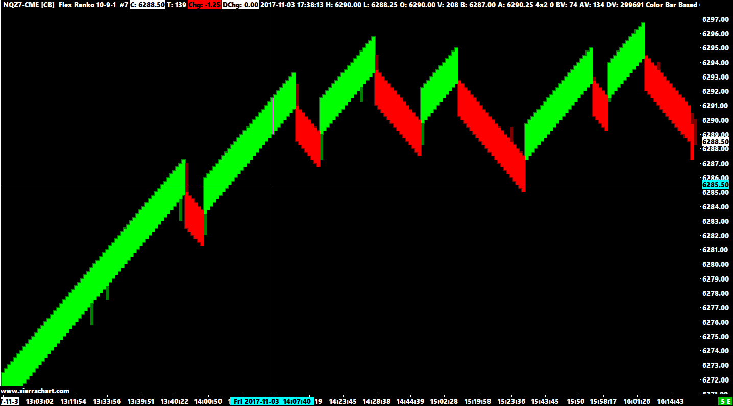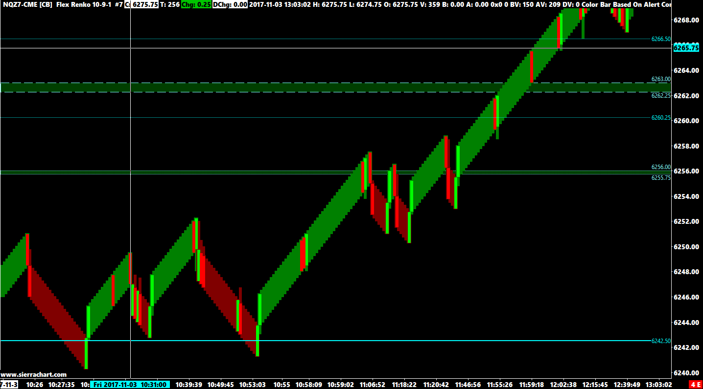 Just to be a bit more specific if it helps with my query. I've attached a screenshot of Flex Renko 10-9-1 from Version 1632 with two(2)simple Color Bar Fill alert studies. 1: Brt.Green if "=C>O" and 2: Brt.Red if "=C<O". For example, if a trend "run" is Up, bars by default are painted dark green. Most of them have the same Open and Close but still conform to the Flex Renko code for continued trend and remain dark green. Some, even though also still conforming to trend code, however, have "internal" numbers (which I can read in my "Chart Values for Tools")where the "C>O" or "C<O" and they are duly and accurately highlighted. They are "filled" as per the simple added alerts. This is something I like to be able to see for my particular purposes, and can thus use that info further in some of my more complex(not very!) alert formulae. Works the same, obviously, for designated "Down" trends painted by default dark red. Screenshot #2 is from today's newest V. 1635. Same chart, same simple alert formulae "C>O" results in ALL bars of a given Up"Trend" highlighted Brt. green and conversely, all Down "trend" runs "filled" Brt. red by "C<O". I reckon that is because "C" now refers to "Renko Close" only and "O" refers to "Renko Open" only, which, by definition/code always has "Up" is "C>O" and Down" is "C<O". I'd sure like to be able to have the option of using some kind of "ID" to continue to "differentiate" in my other alert formulae between "Renko (body) Open/Close" and the actual O-H-L-C which are presented in the Chart Values for Tools Window. http://www.sierrachart.com/image.php?Image=1509819395839.png http://www.sierrachart.com/image.php?Image=1509822359224.png |