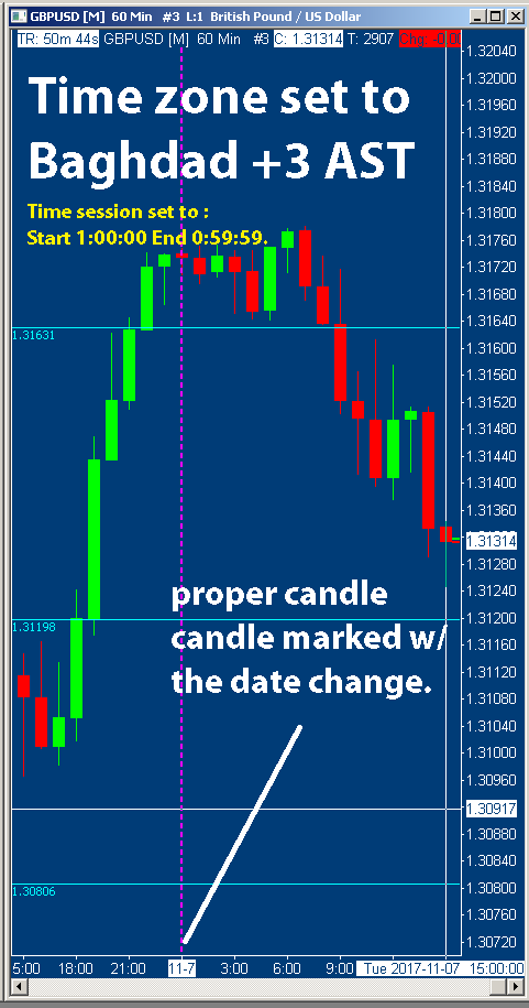 I uploaded two samples of the 60M chart. They are labeled with the settings I used. I basically need to figure out what settings to use for all my charts to have the proper time zone and session time for the forex markets. It seems that no matter what session time I use the date time stamp doesn't post on the proper candle UNLESS the time zone is set to Baghdad +3 AST. Is this because I need to set the time zone to the broker's time zone for data feed? Subsequently some data is being posted in the wrong daily candle if I don't have the proper time zone and time session set. I just want to make certain how to set this one. Thank you for your prompt reply. |