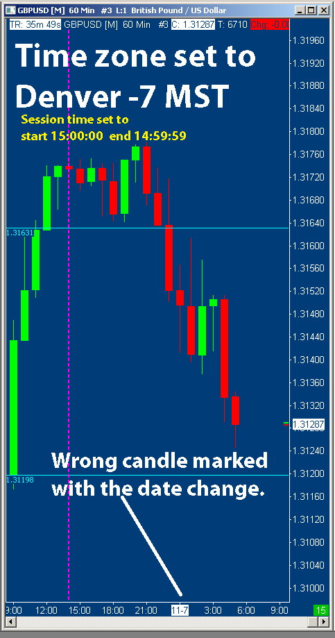 So I've read through all the instructions and several threads about global time zone settings, and session time settings. I'm setting up for forex market chart books. I've noticed if I use my time zone, MST-7, no matter what session time I use in the chart settings the date is wrong on the time scale. I followed the instructions on the help to open a new chart and I see the prescribed time settings there. After all this, the only way I've been able to get the first candle of the day to show the right date is to use the +3 time zone. Any ideas to get the dates times to sync up on the real time? It's parting data on the daily candles between days, which I don't want.