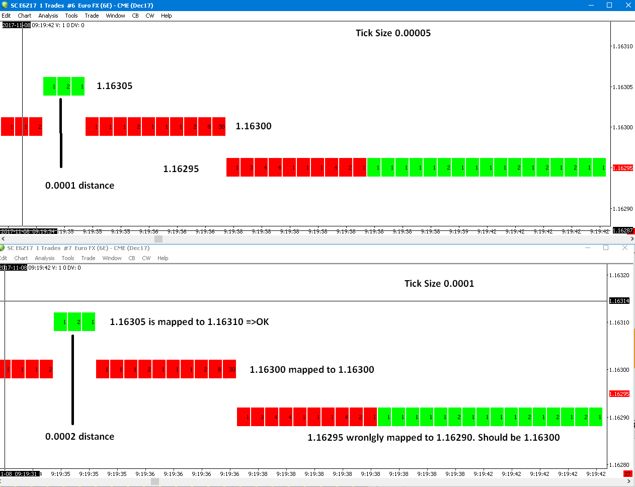 Here is example on 6E. I attach original tick size 0.00005 and same chart on 0.0001 tick size. Some ticks on are wrongly mapped on the 0.0001 chart, so 2 price ticks separated by 0.0001 are now separated by 0.0002 It happens for only a couple price levels, but these price levels will always be wrongly mapped. |