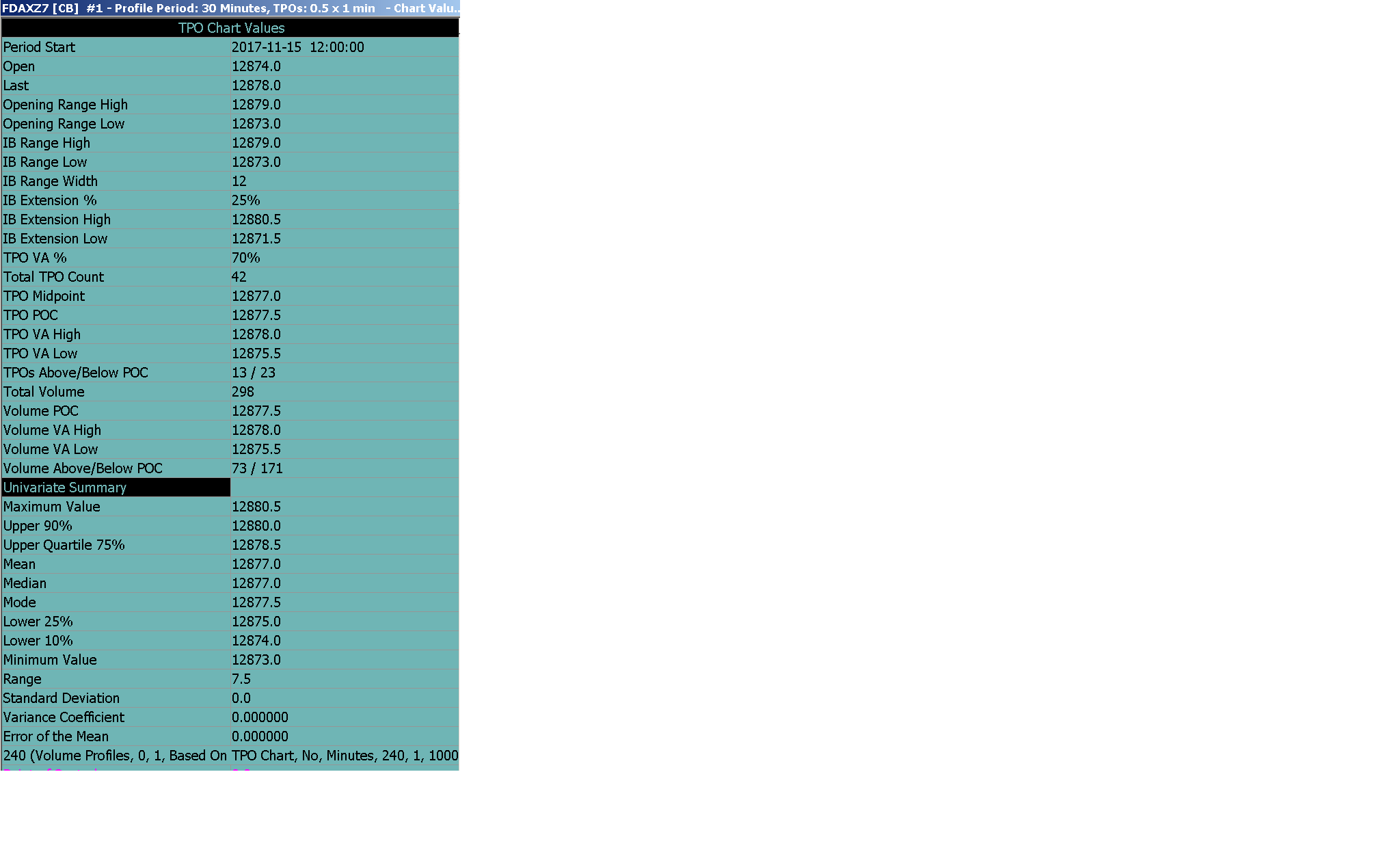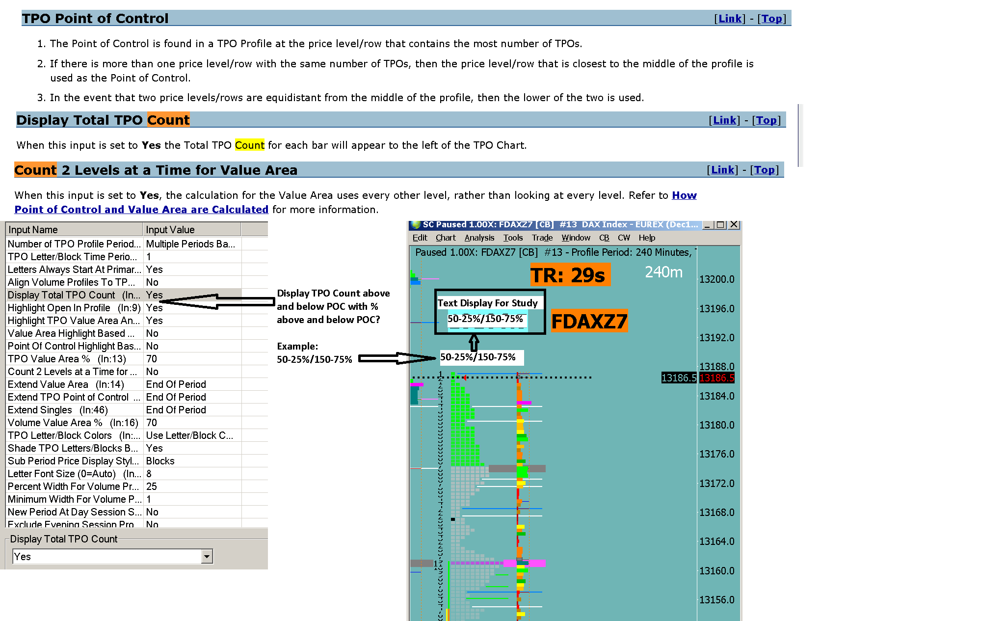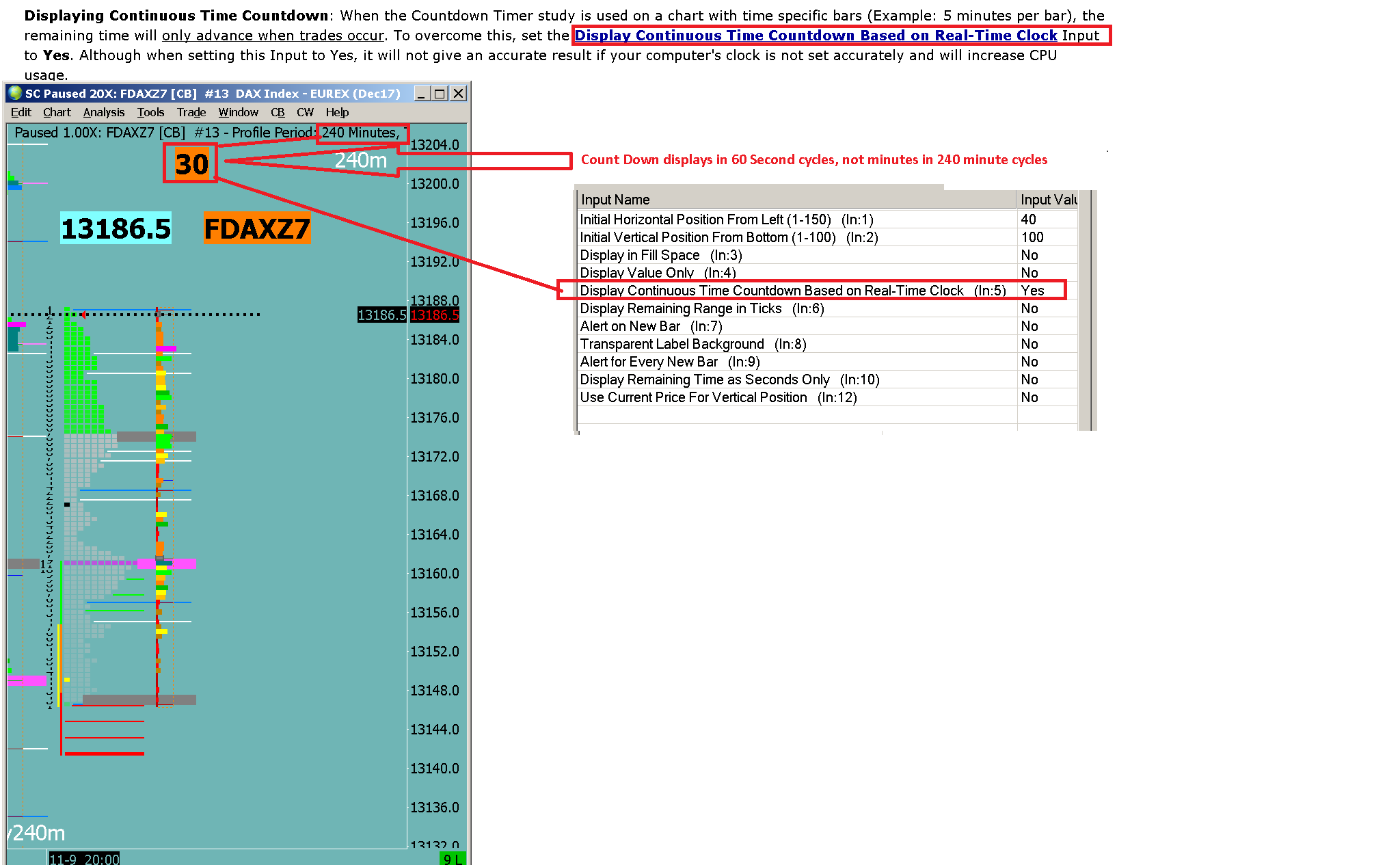 1. This will be added to the next release. But the information will be displayed in the Chart Values Window for the chart. 2. Here is the documentation for the Countdown Timer for TPO Profile Charts: Countdown Timer: Countdown Timer on TPO Profile Charts Sierra Chart Support - Engineering Level Your definitive source for support. Other responses are from users. Try to keep your questions brief and to the point. Be aware of support policy: https://www.sierrachart.com/index.php?l=PostingInformation.php#GeneralInformation For the most reliable, advanced, and zero cost futures order routing, *change* to the Teton service: Sierra Chart Teton Futures Order Routing Date Time Of Last Edit: 2017-11-14 07:35:59