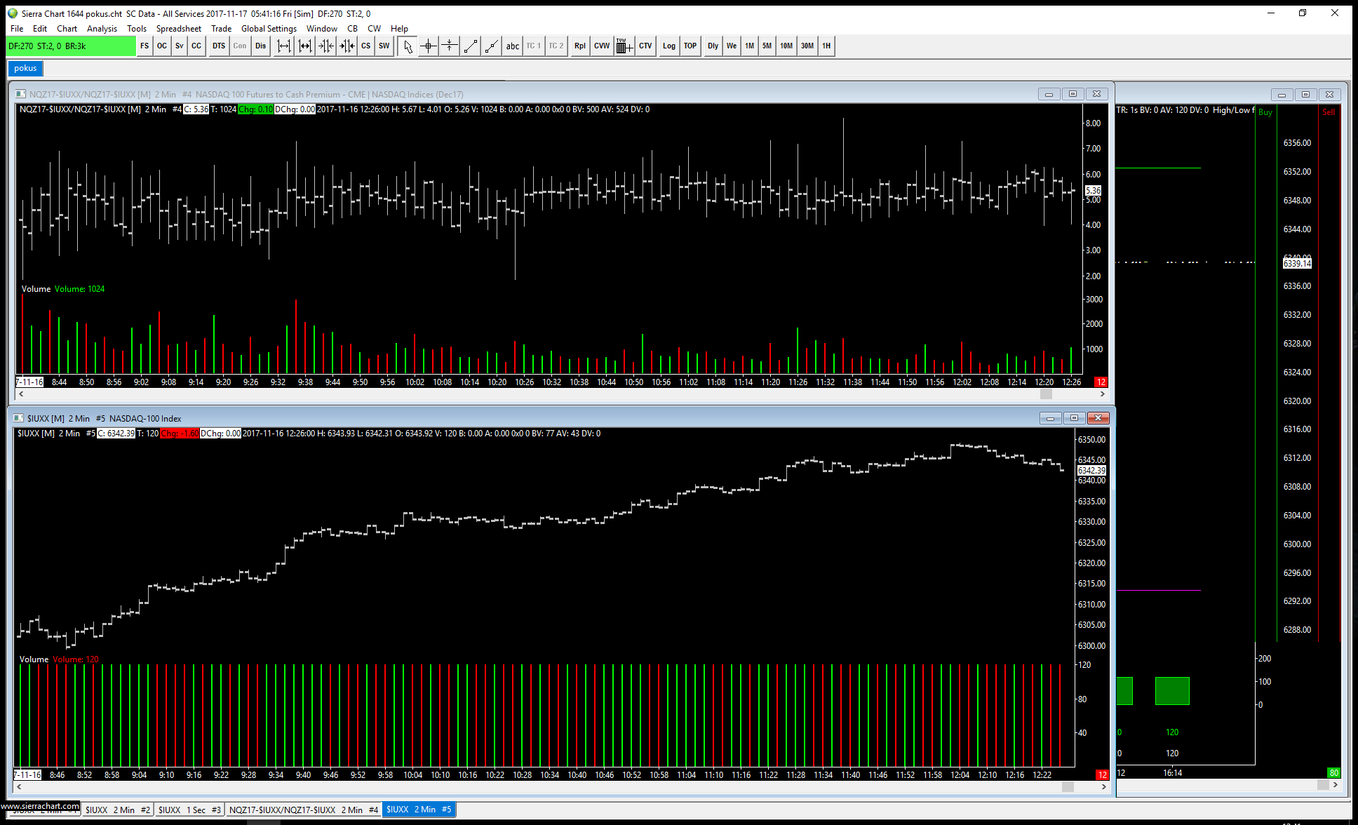 Hello, I have a problem with correct symbols and live data feed. I have sierra 1644 SP5, Sierra Chart Real-Time and Historical Exchange Data Feed (trial) and CME, Globex only (For users without a trading account) (trial) In Data/Trade services setting I have SC Data – All Services and I check Allow Support for SCDF I use 2 minutes intraday chart When I use NQZ17-$IUXX then data lines in chart are incorrect, like all of them are within few points. The value of point is also incorrect as it starts on 0 and not from 6300… When I use just $IUXX then data lines are correct but volume for every line are exactly the same 120. In both instances I don’t have real data but late data with 1 hour delay. I really tried to read your Support board, but I still feel lost. Please help me to solve this. Thank you Branislav http://www.sierrachart.com/image.php?Image=1510918882231.png |