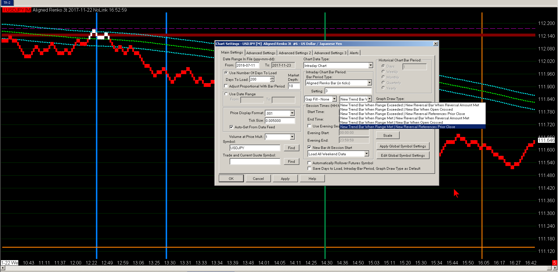 Please see attached images SC-1 and SC-2. SC-1: About Sierra Chart - Version: 1644 SC-2: Aligned Renko Bar (in ticks) -> New Trend Bar When Range Met | New Reversal Reference Prior Close 1. Please note the Renko shape/form in SC-2. 2. I am unable to duplicate the renko shape/form of SC-2 in the current version 1649. In version 1649 I have tried every [New Trend Bar] option from the drop-down selection but every selection produces only standard [New Trend Bar]shape/form. 3. Surely this is not working correctly. 4. Please advise. Note: I am running 1644 on one system and 1649 on another so that I can compare/monitor fixes. Date Time Of Last Edit: 2017-11-23 03:39:43