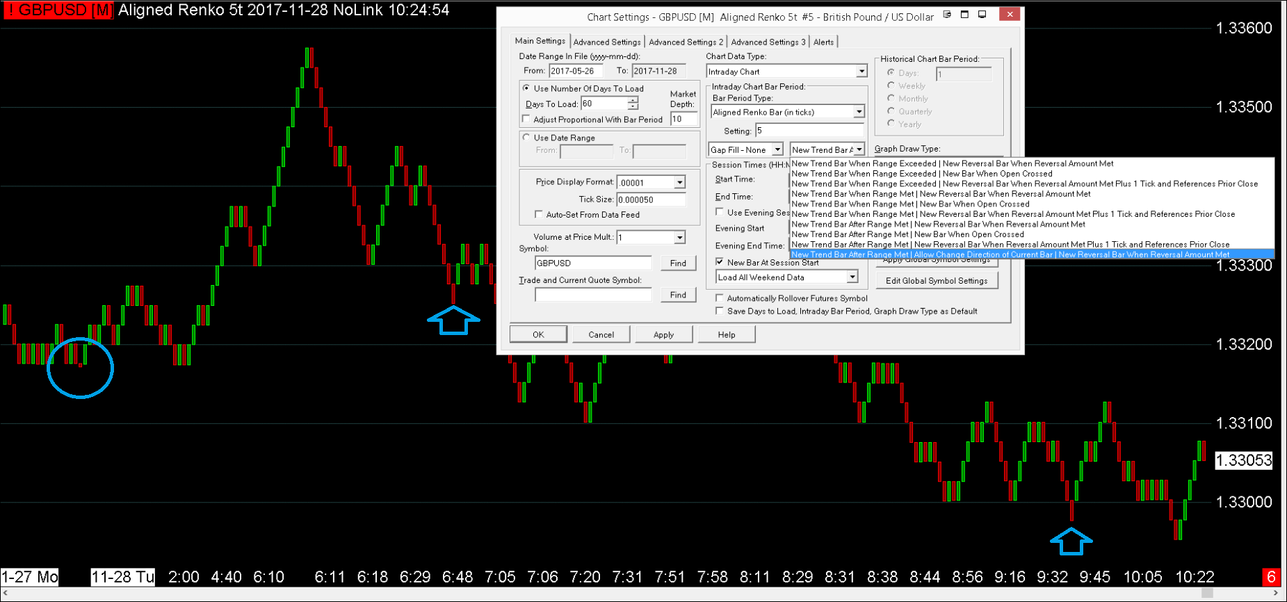 There has been a change with that setting and it is documented on the What is New page for version number 1647: https://www.sierrachart.com/index.php?page=doc/Whats_New.php#SCVer1647 In 1647 and higher, these settings work absolutely correctly. You need to refer to the descriptions here: Renko Bar Charts: Renko New Bar Mode We cannot provide further help for this. Sierra Chart Support - Engineering Level Your definitive source for support. Other responses are from users. Try to keep your questions brief and to the point. Be aware of support policy: https://www.sierrachart.com/index.php?l=PostingInformation.php#GeneralInformation For the most reliable, advanced, and zero cost futures order routing, *change* to the Teton service: Sierra Chart Teton Futures Order Routing Date Time Of Last Edit: 2017-11-23 04:48:49