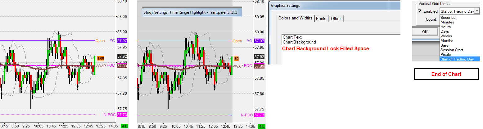 From my point of view it would be very helpful if you could set a different color for the Fill Lock Space. At the moment I use the Study "TimeRangeHighlight". But if you use more than one Regions you have to set it for each one. Is it possible to add the possibility for that purpose in the Graphics Setting and if not maybe as an additional option for Vertical Grid Lines (End of Chart). Pls take a look on my pic. |