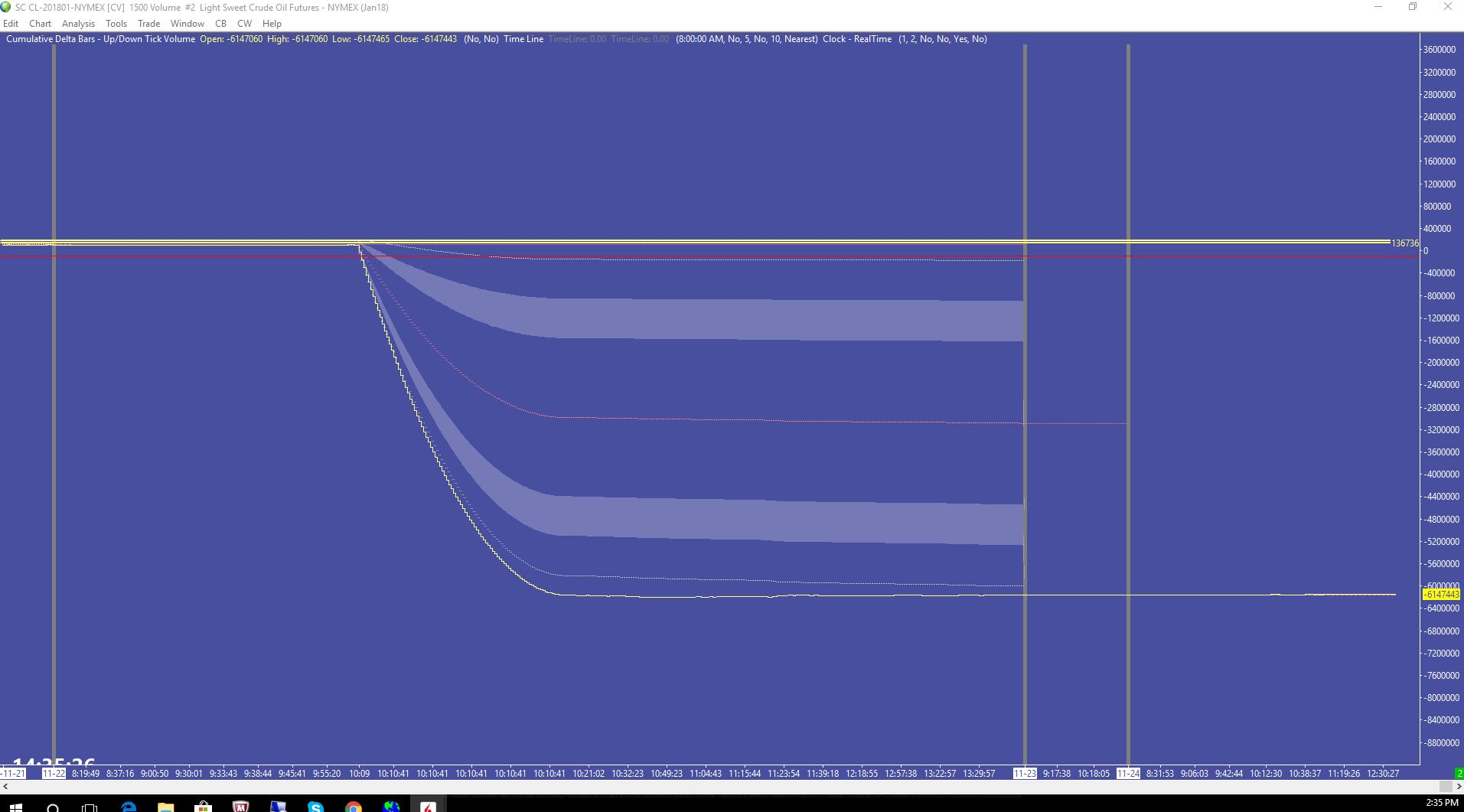Hi, All of a sudden when I rolled CL to current month my cumulative delta data has gone nuts. I have updated to latest version of SC, I have deleted charts and rebuilt them, I have reloaded and recalculated data, all to no avail. Any suggestions. I have attached two pics. http://www.sierrachart.com/image.php?Image=1511642507439.png http://www.sierrachart.com/image.php?Image=151164263483.png |
