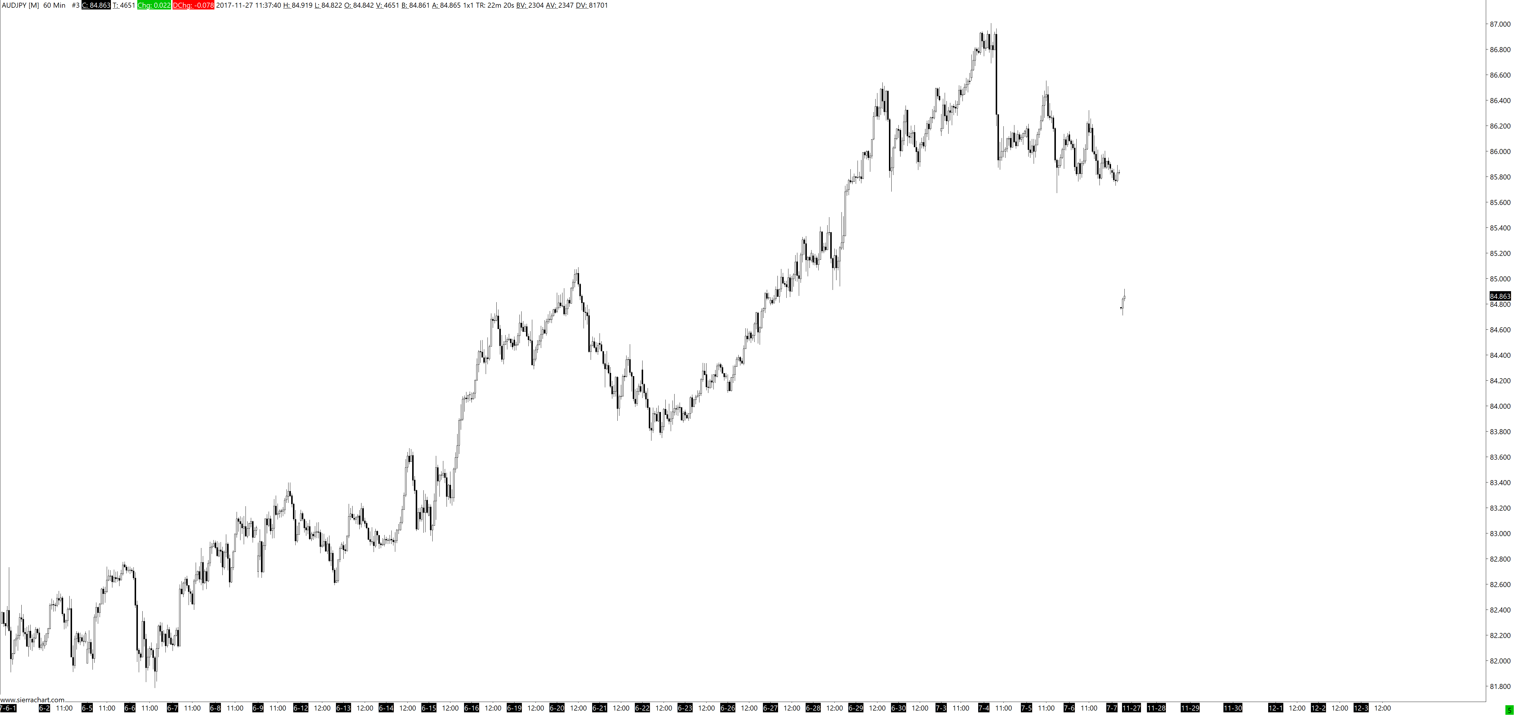 You are repeatedly getting this error: HD Request # 33 | Error downloading historical Intraday data for AUDJPY. The network socket has been closed. Retrying download. | 2017-11-27 08:12:00 There is some kind of Internet connectivity issue you are having. Refer to: Historical Intraday Data (Missing Data / Download Errors / Viewing More Data): Error when Downloading Historical Intraday Data from the Sierra Chart Historical Data Server Sierra Chart Support - Engineering Level Your definitive source for support. Other responses are from users. Try to keep your questions brief and to the point. Be aware of support policy: https://www.sierrachart.com/index.php?l=PostingInformation.php#GeneralInformation For the most reliable, advanced, and zero cost futures order routing, *change* to the Teton service: Sierra Chart Teton Futures Order Routing |