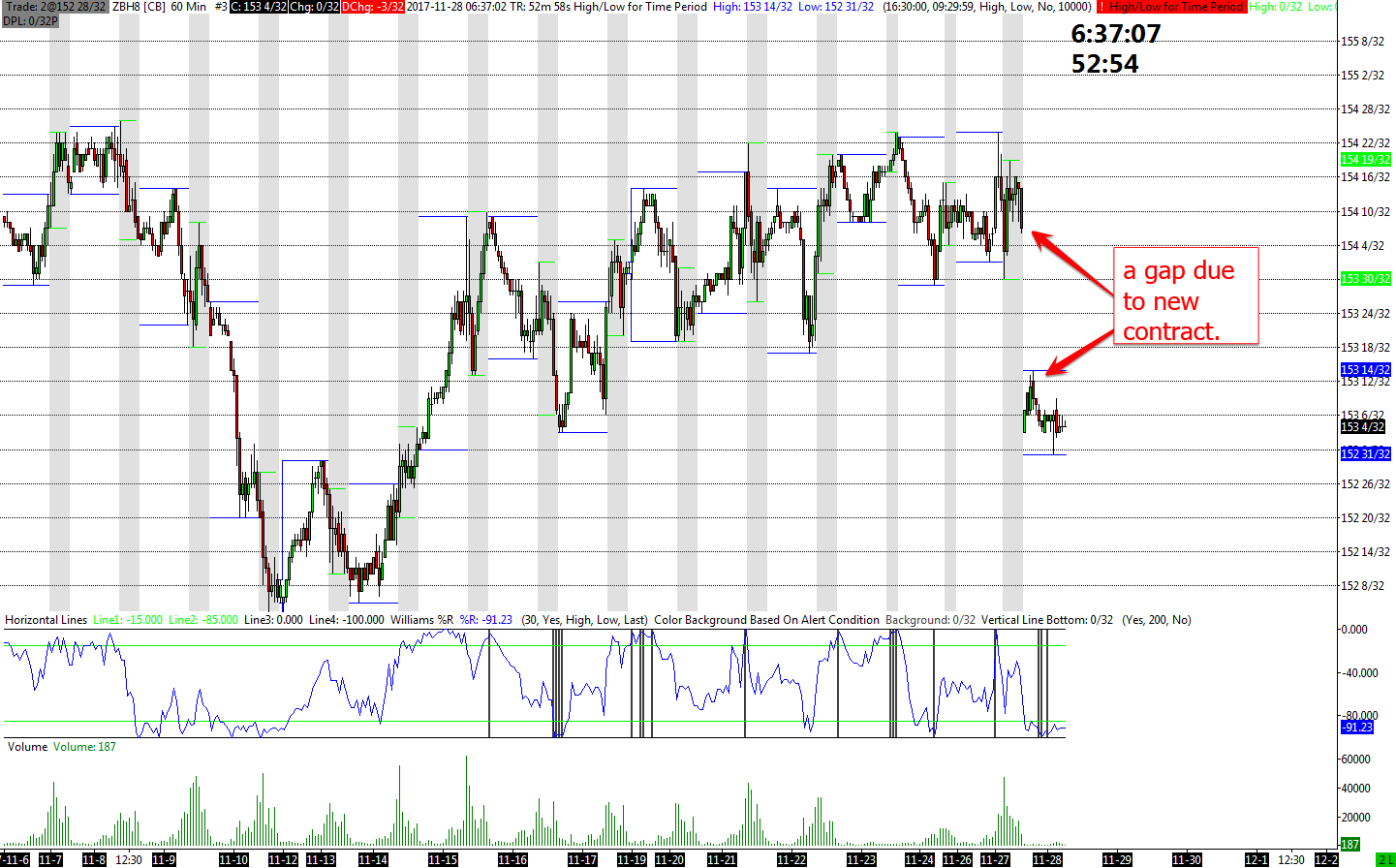 I have a customer who claims he has a gap in his bond (ZB) chart due to rollover. has deleted all data and downloaded, see below, claims the daily chart has a gap as well When looking at the ZB chart there is a gap since yesterday due to a new contract being traded. When you plot this chart, do you also see this or is it just me? Of course, this is the same in all time frame below one day. I keep having these problems when the contract changes for almost two years now. I keep asking but I still do not have an answer. Fact is it messes up the whole chart as there is a gap. I do use ‘continuous futures contract - date rule rollover, back adjusted’. NG also had a gap when the contract changed a couple of days ago. |