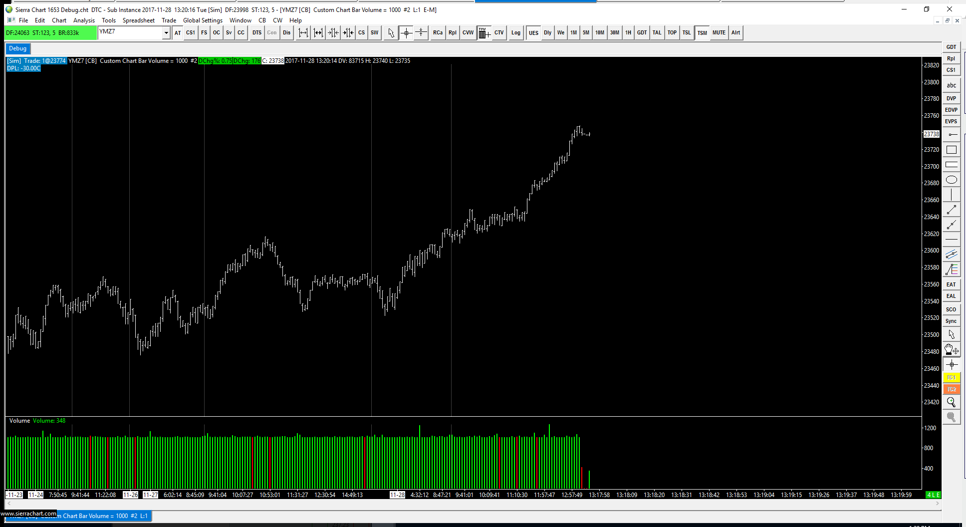 Attached is my simple test chartbook. The custom chart bar function is SierraChartStudies.scsf_CustomChartBarsExample v1653 The problem is subtle (IMHO nasty). :) 1. I have to be connected (live; I haven't tried it in replay). In my case I'm connected via DTC - Sub Instance to another machine on my LAN, but I doubt if that's relevant. 2. I press UES button to force reloads. (I wish I had a better way.) 3. About 1 time out of 3 I see extremely short volume bars near the end of the chart. http://www.sierrachart.com/image.php?Image=1511893217332.png Debugging into this, I notice that ChartBarInterface.CurrentBarIndex "skips" -- that is CustomChartBarBuildingFunction() is not called for one or more bars. Cheers, Dale |