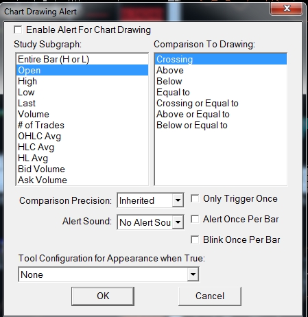 Refer to: Chart Drawing Tools: Configuring a Default Chart Drawing Alert Condition Sierra Chart Support - Engineering Level Your definitive source for support. Other responses are from users. Try to keep your questions brief and to the point. Be aware of support policy: https://www.sierrachart.com/index.php?l=PostingInformation.php#GeneralInformation For the most reliable, advanced, and zero cost futures order routing, *change* to the Teton service: Sierra Chart Teton Futures Order Routing |