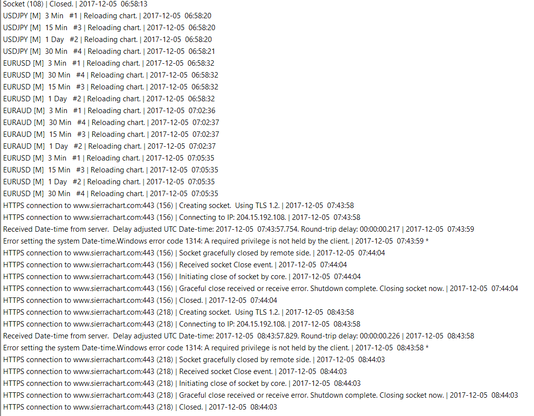 What you are experiencing is an error setting the system Date-Time. Refer to: Global Settings Menu: Set System Date-Time from Server (Global Settings menu) Sierra Chart Support - Engineering Level Your definitive source for support. Other responses are from users. Try to keep your questions brief and to the point. Be aware of support policy: https://www.sierrachart.com/index.php?l=PostingInformation.php#GeneralInformation For the most reliable, advanced, and zero cost futures order routing, *change* to the Teton service: Sierra Chart Teton Futures Order Routing |