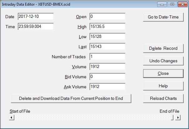 We have looked at this and there is a difference in data being transmitted from BitMEX on different connections. Will synchronize the data since December 10. But you are going to have inconsistencies with Volume bar charts There is nothing we can do about this. We will not be responding further about this. This is something that is simply not within our control. Sierra Chart Support - Engineering Level Your definitive source for support. Other responses are from users. Try to keep your questions brief and to the point. Be aware of support policy: https://www.sierrachart.com/index.php?l=PostingInformation.php#GeneralInformation For the most reliable, advanced, and zero cost futures order routing, *change* to the Teton service: Sierra Chart Teton Futures Order Routing Date Time Of Last Edit: 2017-12-12 17:13:10