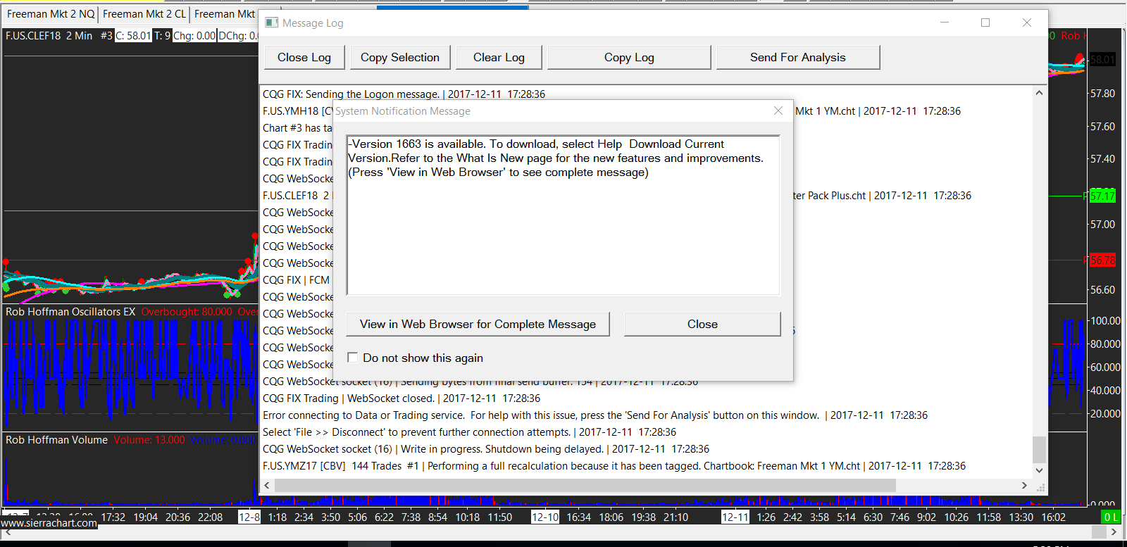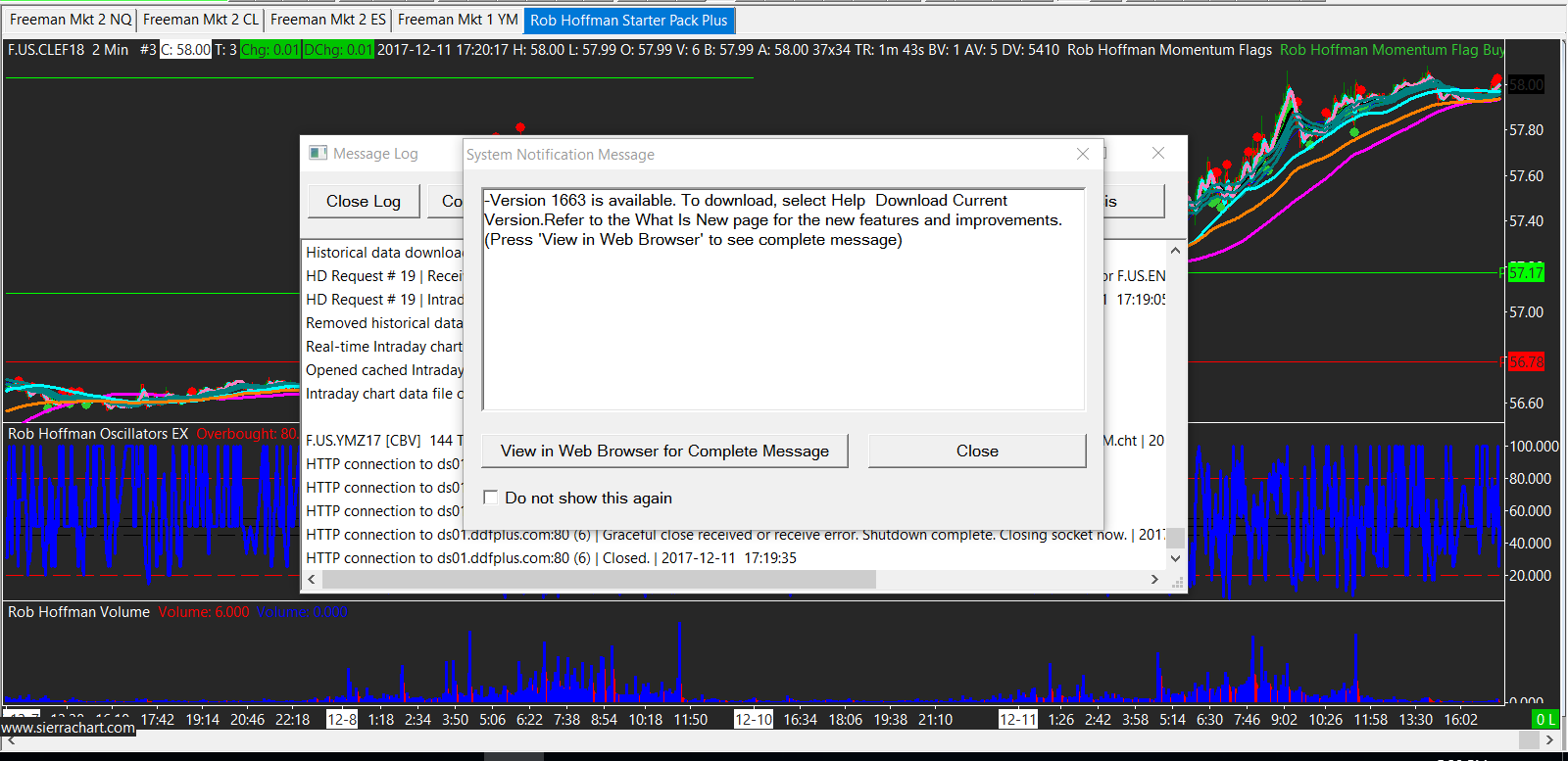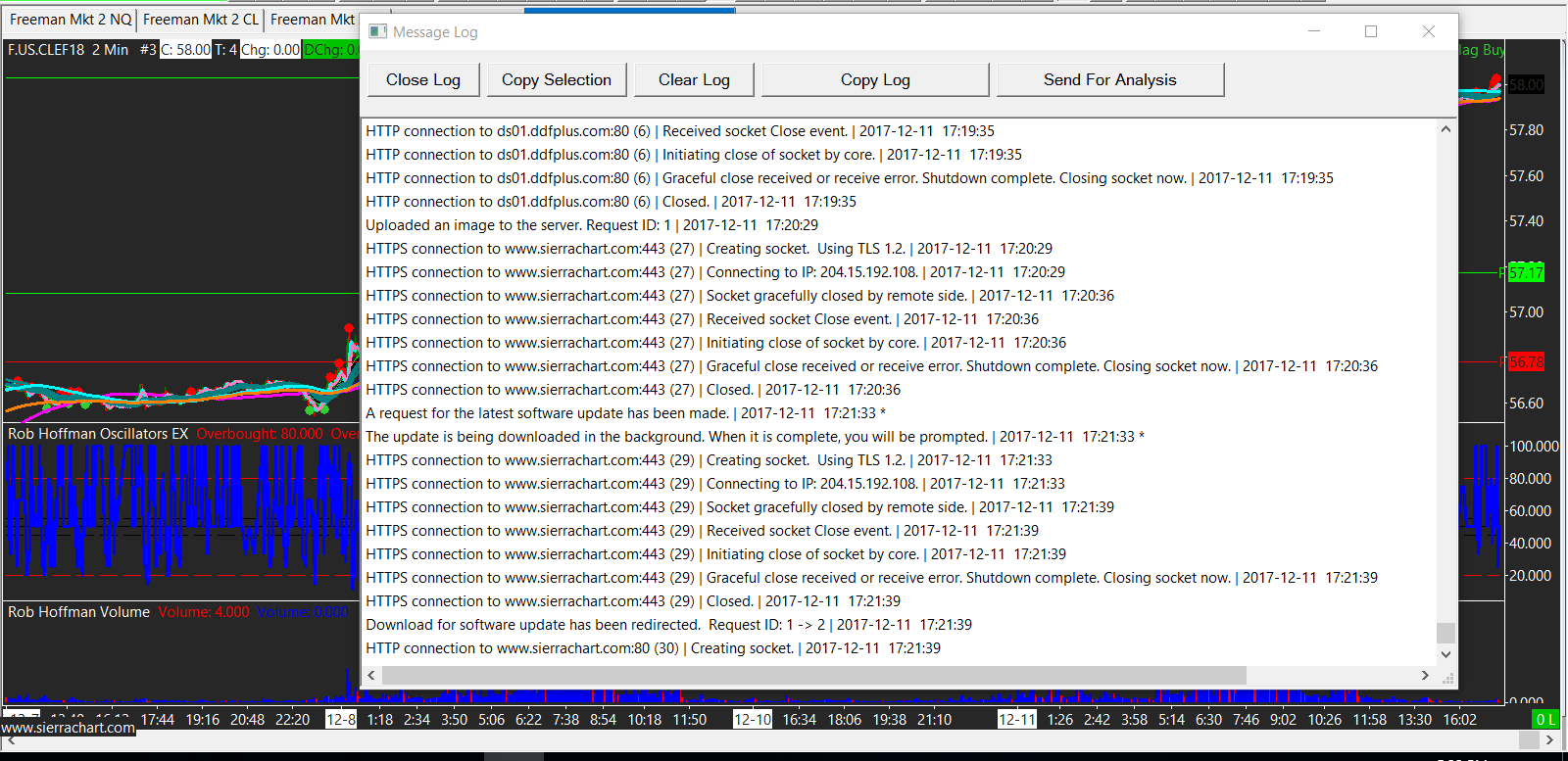 This is the message to download. http://www.sierrachart.com/image.php?Image=1513041630459.png This is what the log says shortly after starting "help>download current" http://www.sierrachart.com/image.php?Image=1513041742568.png Then it says (can't take a pic) "The software update has been downloaded...Sierra Chart needs to be closed..." I click yes, tell it to save, it shuts down, I restart, and then I am back at the beginning with the message to download 1623 |