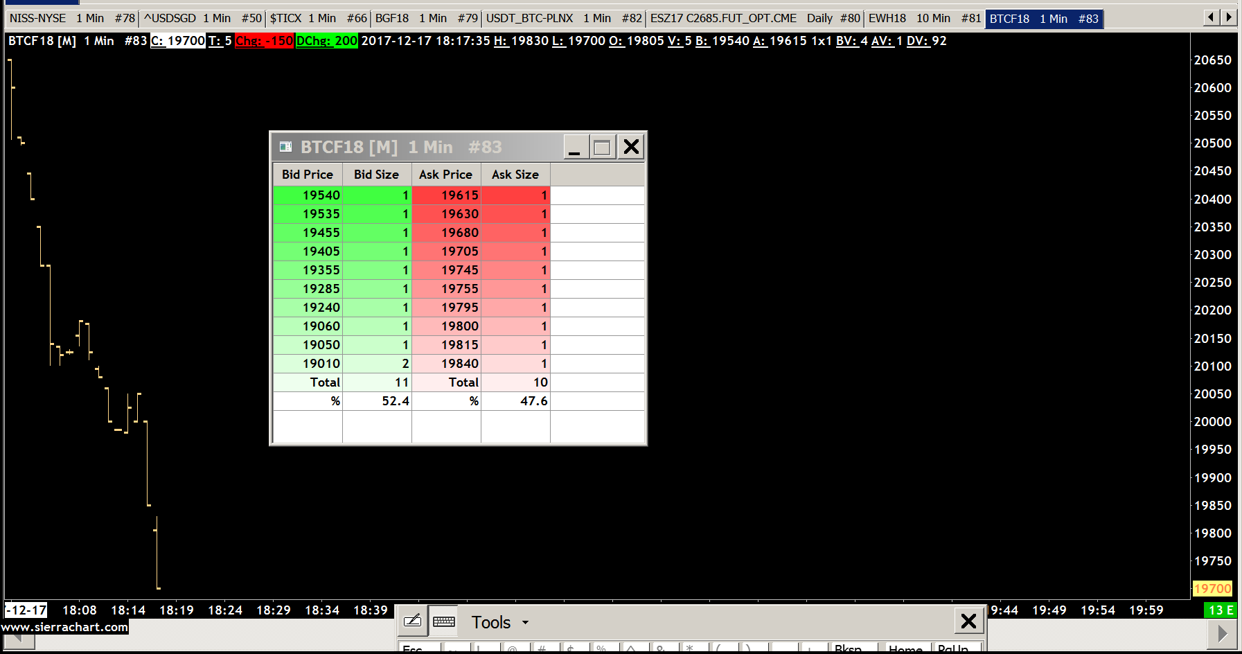 What we observe from the CQG data feed for F.US.BTCF18 is incomplete data. We do see updating, but it is incomplete. We do not know why. Could only seem to be a problem on the CQG side. With the Sierra Chart Exchange Data Feed we do see complete data: http://www.sierrachart.com/image.php?Image=1513552710352.png Sierra Chart Support - Engineering Level Your definitive source for support. Other responses are from users. Try to keep your questions brief and to the point. Be aware of support policy: https://www.sierrachart.com/index.php?l=PostingInformation.php#GeneralInformation For the most reliable, advanced, and zero cost futures order routing, *change* to the Teton service: Sierra Chart Teton Futures Order Routing |
