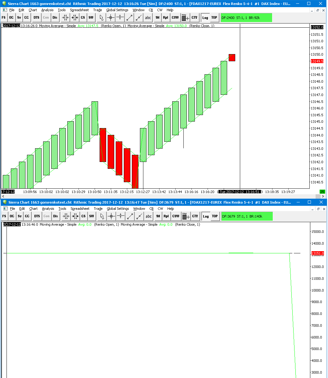 Hi, It seems that on some charts, Renko Open and Renko Close are often equal to 0. Here's a sample on FDAX. I plot SMA(Renko Open,1) and SMA(Renko Close,1) Sometimes there is a value, sometimes it's 0 and SMA gets off the chart. |