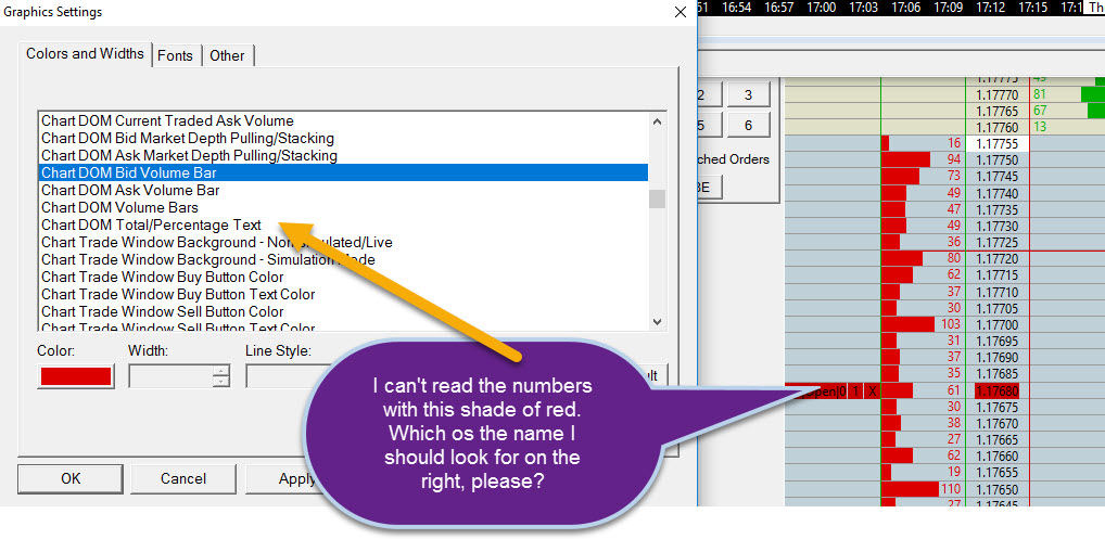 This is the color setting: Customizing Fonts, Colors, Line Styles, and Widths for Chart Trading, Chart DOM, and Trade DOM: Trade DOM Order Line Text Color Sierra Chart Support - Engineering Level Your definitive source for support. Other responses are from users. Try to keep your questions brief and to the point. Be aware of support policy: https://www.sierrachart.com/index.php?l=PostingInformation.php#GeneralInformation For the most reliable, advanced, and zero cost futures order routing, *change* to the Teton service: Sierra Chart Teton Futures Order Routing |