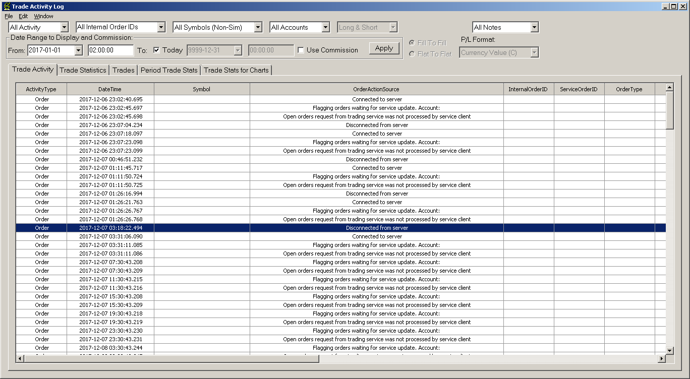 Refer to this section here for help with this: Spreadsheet Systems, Alerts and Automated Trading: Ignored Signals With Spreadsheet Systems or Alerts (Ignored Signals With Spreadsheet Systems Or Alerts) Also the controls at the top of the Trade Activity Log you posted a screenshot of, are not set correctly. You need to select the particular simulated Symbol and the simulated trading Account. Follow the instructions here: Trade Activity Log: Viewing Historical Trade Activity Sierra Chart Support - Engineering Level Your definitive source for support. Other responses are from users. Try to keep your questions brief and to the point. Be aware of support policy: https://www.sierrachart.com/index.php?l=PostingInformation.php#GeneralInformation For the most reliable, advanced, and zero cost futures order routing, *change* to the Teton service: Sierra Chart Teton Futures Order Routing Date Time Of Last Edit: 2017-12-18 17:56:19