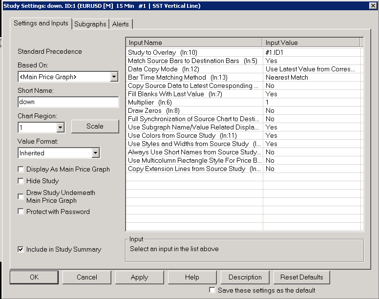 You will need to use Chart >> Recalculate but this is all. We suppose we can add an Input to always updates these particular settings on the Study/Price Overlay study, from the source study but it is going to be less efficient. Sierra Chart Support - Engineering Level Your definitive source for support. Other responses are from users. Try to keep your questions brief and to the point. Be aware of support policy: https://www.sierrachart.com/index.php?l=PostingInformation.php#GeneralInformation For the most reliable, advanced, and zero cost futures order routing, *change* to the Teton service: Sierra Chart Teton Futures Order Routing Date Time Of Last Edit: 2017-12-29 09:42:54