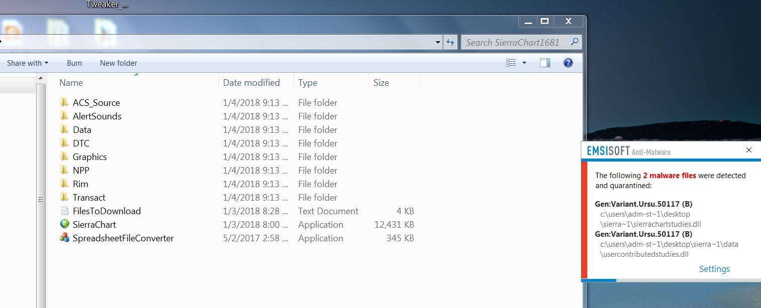 Hi Support, I discovered two dll files in the latest version of Sierra (1681) have been infected by malware as of January 4th, 2018: 1) sierrachartstudies.dll 2) usercontributedstudies.dll (inside the /Data/ folder) Both files have been infected by Gen:Variant.Ursu.50117 (B), as detected by Emsisoft Anti-Malware installed in my PC. Please see attached JPG for proof. As well, I tried downloading and scanning all zipped installation files from this page: http://www.sierrachart.com/index.php?page=doc/SCZipInstallerList.php, and found all files on the page have been infected (from version 1676 to 1681). The latest installer-software-downloaded Sierra (v1681) has also been infected. Both dll files were automatically quarantined by my anti-malware software once discovered and now Sierra does not show any of the studies I have put on the chart :( Please kindly advise when the files have been cleaned, and consider investing in better anti-malware protection for the future. Thanks. |