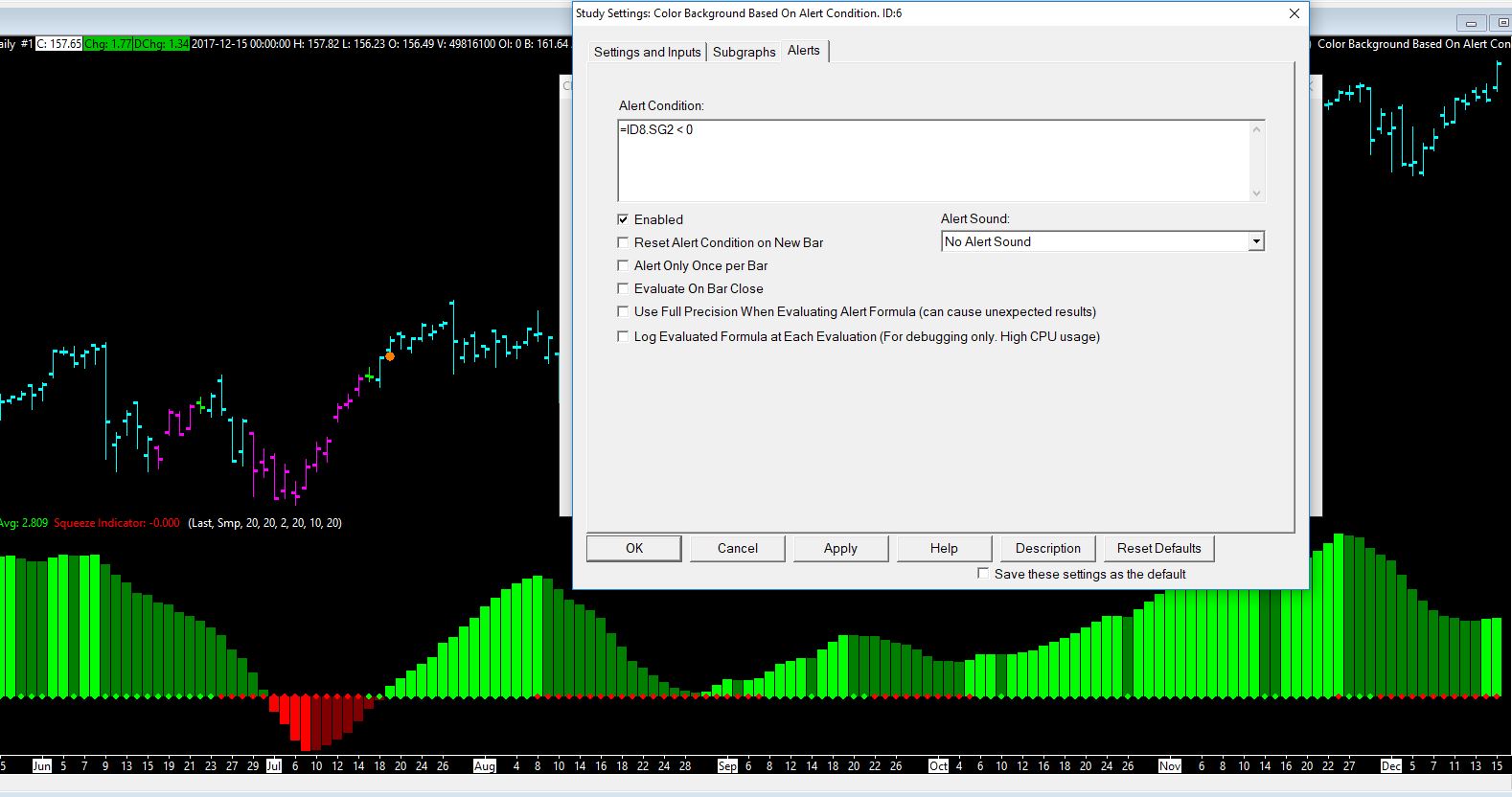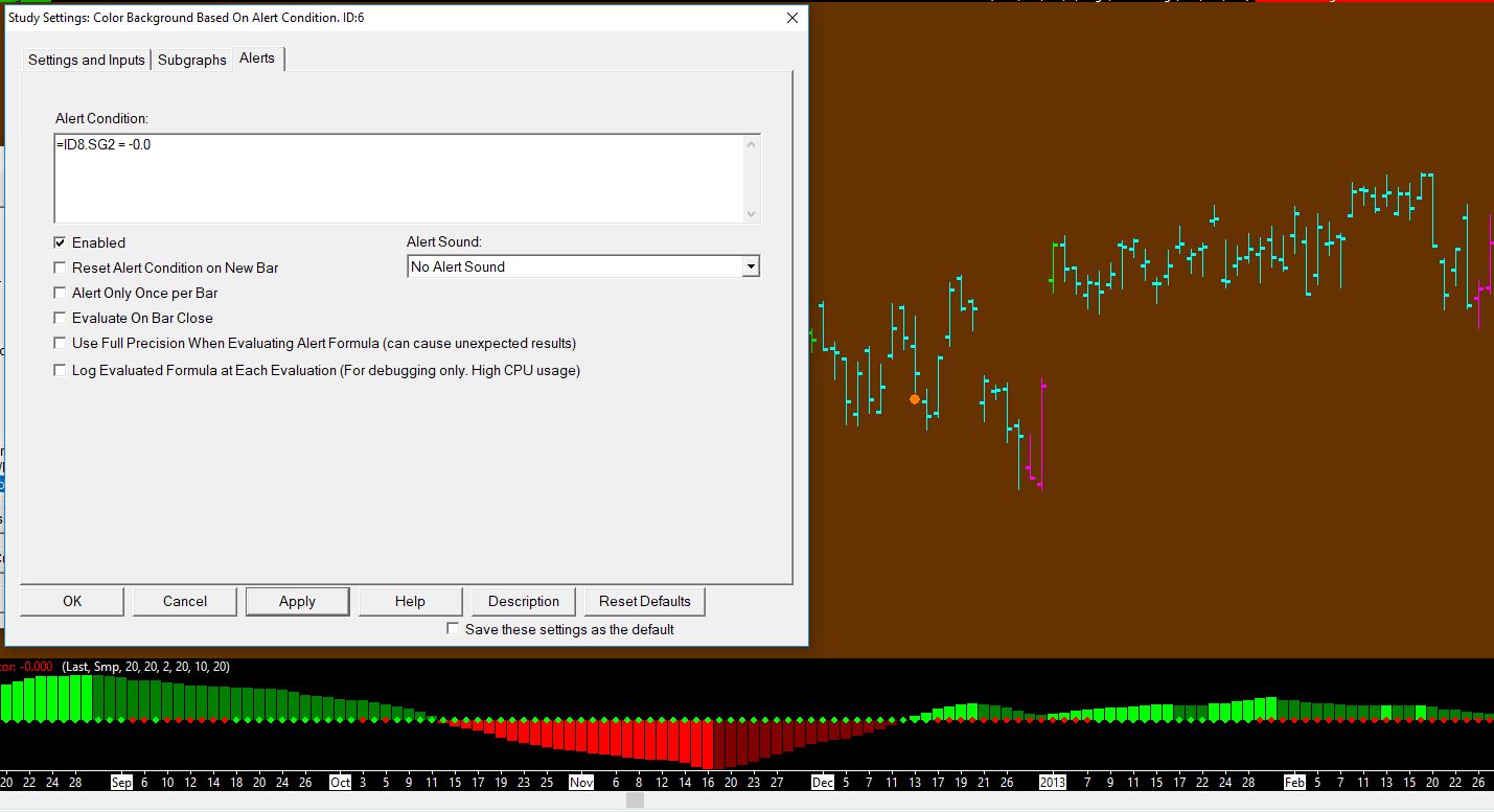 Enable the option Use Full Precision when Evaluating Alert Formula. We will make the value for the dots .001. Sierra Chart Support - Engineering Level Your definitive source for support. Other responses are from users. Try to keep your questions brief and to the point. Be aware of support policy: https://www.sierrachart.com/index.php?l=PostingInformation.php#GeneralInformation For the most reliable, advanced, and zero cost futures order routing, *change* to the Teton service: Sierra Chart Teton Futures Order Routing |