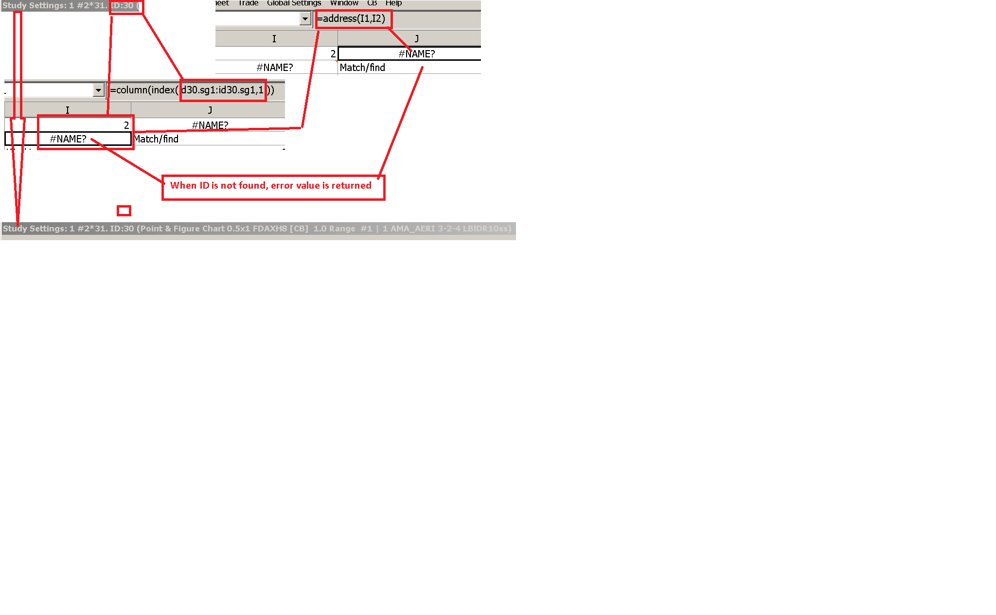 In attempting to use a value from a Study/Price Overlay of chart in column K/M of Spreadsheet System for trading, I didn't find the id named on the Overlay study of the Chart on the Spreadsheet System for Trading. Are overlay values available in some other way on spreadsheet, or simply not available? Or am I doing something wrong? Thanks for your help, see attachment for use of index and address functions which usually locates an ID.
