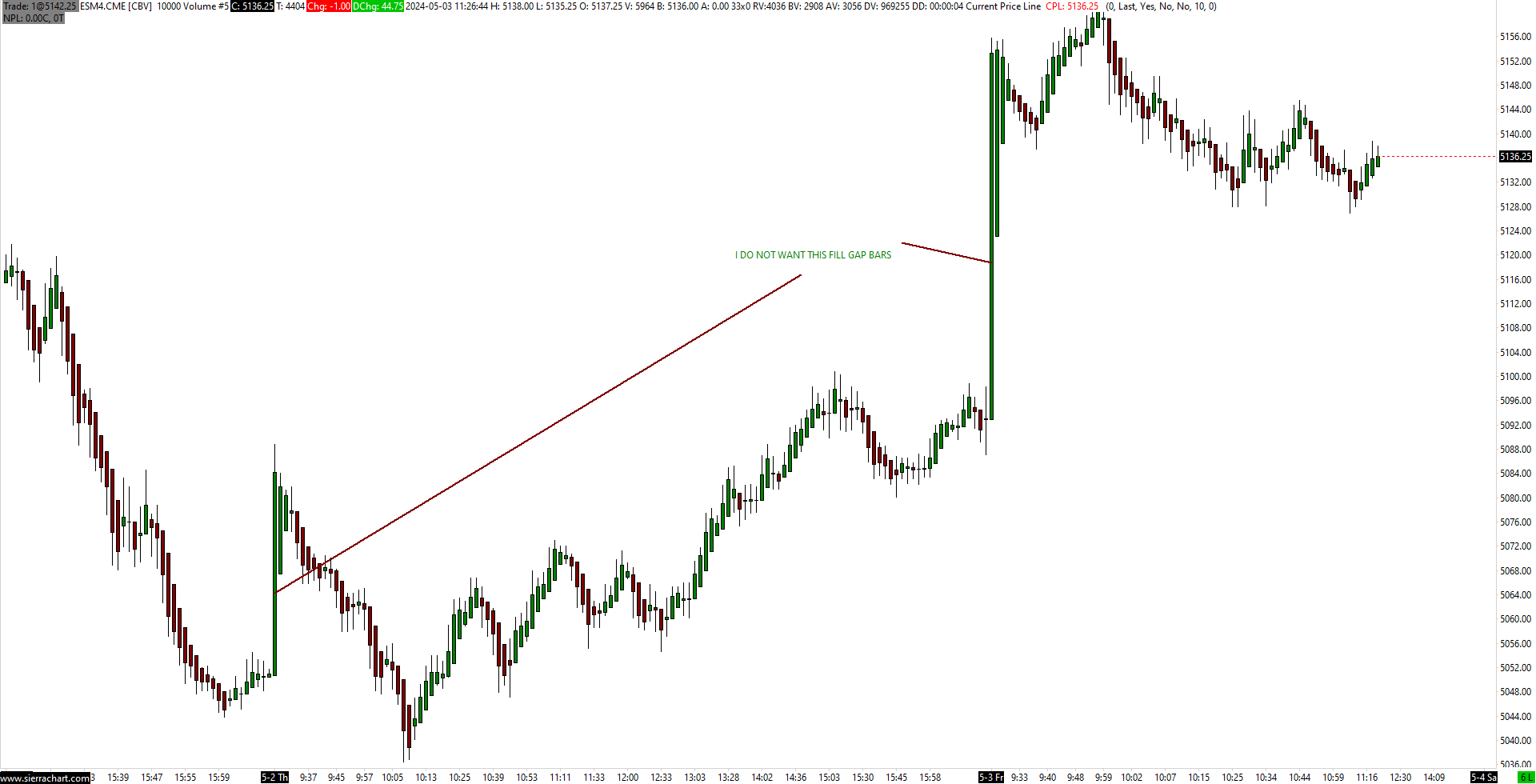 https://www.sierrachart.com/image.php?Image=1714750006580.png Please see the image above. I have my session times set on 9.30-16.30 NY time. When the market open (at 9.30) I do not want those bars drown, I just want to see the gap in order to see very well where the market opened. I hope I was clear. My chart settings: Gap fill: NONE New bar at session start: YES Apply intraday session times to intraday chart: NO (on YES nothing change) Chart data type: INTRADAY CHART Please try to clirify it to me. Thank you |