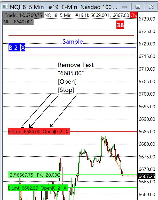 Is there a way to add/remove text like price/position in the order fill line on the chart....? Sample "S(Lmt)6650.25(Open)5"----------- Sample "S lmt 5"-------------- |