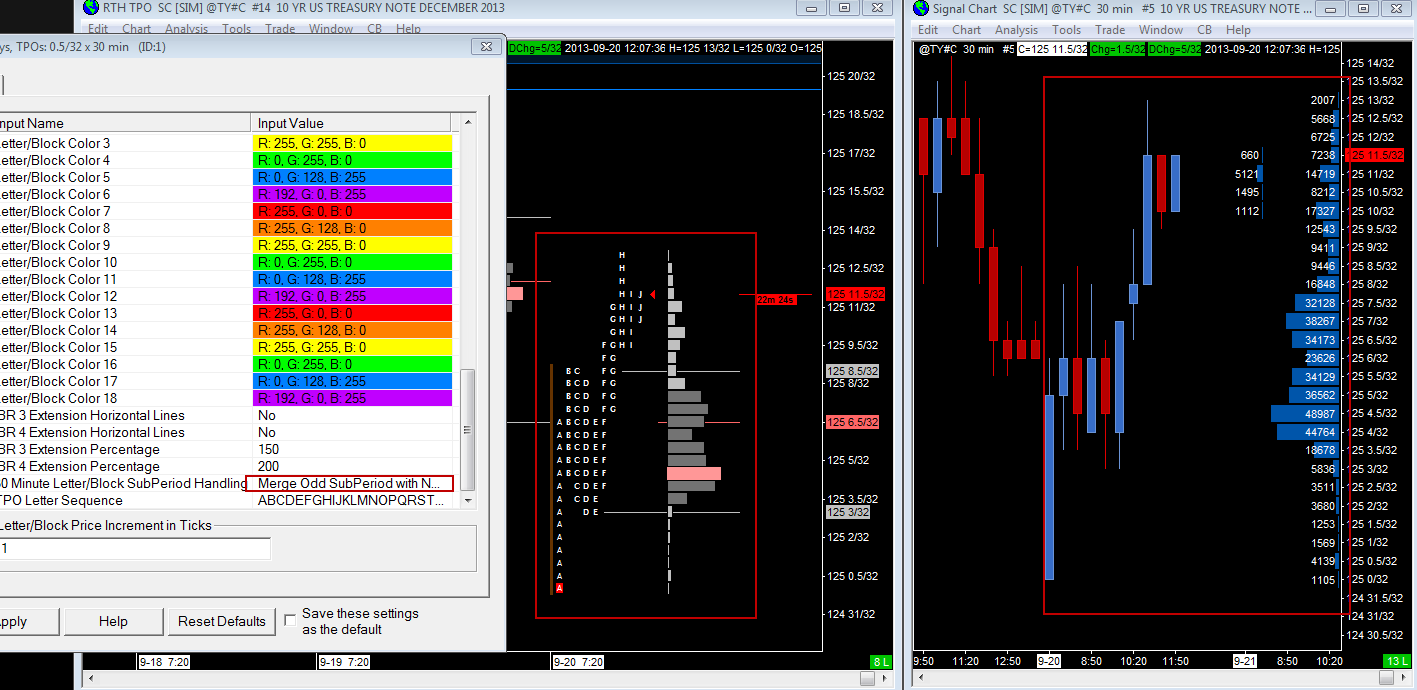 I just love the merge odd subperiod for treasuries TPO charts. Now I ask, is there any way to build candlesticks based on this "merge odd period"? The idea is to have the chart setup on the right, where I have two profiles side by side, one showing the volume for the session and the other for the last bar. The problem here is the fact that the 30min candlesticks does not match the TPO 30min periods which creates some reading confusion. Let me do ask another question, what about plot two VbP side by side on the TPO chart, plotting only today's trading day, the same way I have on the candlestick chart? For this to happen the VbP should allow other types of volume graph periods instead of Based on TPO Chart only. Thank you. |