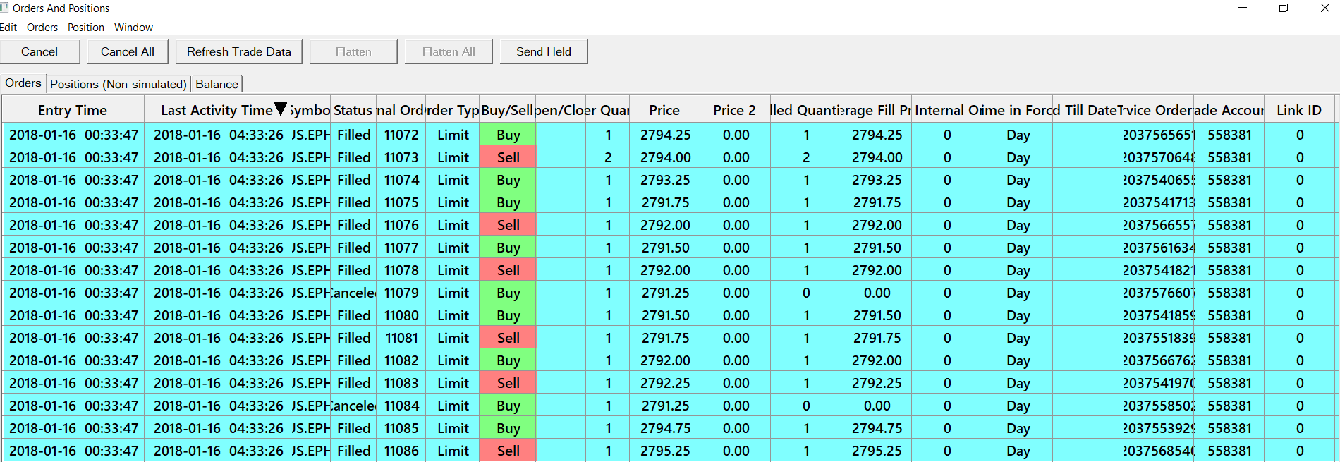 We cannot reproduce the problem of the Order Entry Time changing and do not see why that would happen. The only conceivable way is if the order were to be canceled and replaced with another order. Maybe upon connection to the CQG system that is happening for reasons which is not clear to us. We tried to reproduce this but we could not. The Last Activity Time does change anytime there is an order update even when reconnecting and the current orders are received from the server. So that is expected and normal. Sierra Chart Support - Engineering Level Your definitive source for support. Other responses are from users. Try to keep your questions brief and to the point. Be aware of support policy: https://www.sierrachart.com/index.php?l=PostingInformation.php#GeneralInformation For the most reliable, advanced, and zero cost futures order routing, *change* to the Teton service: Sierra Chart Teton Futures Order Routing Date Time Of Last Edit: 2018-01-16 16:14:16