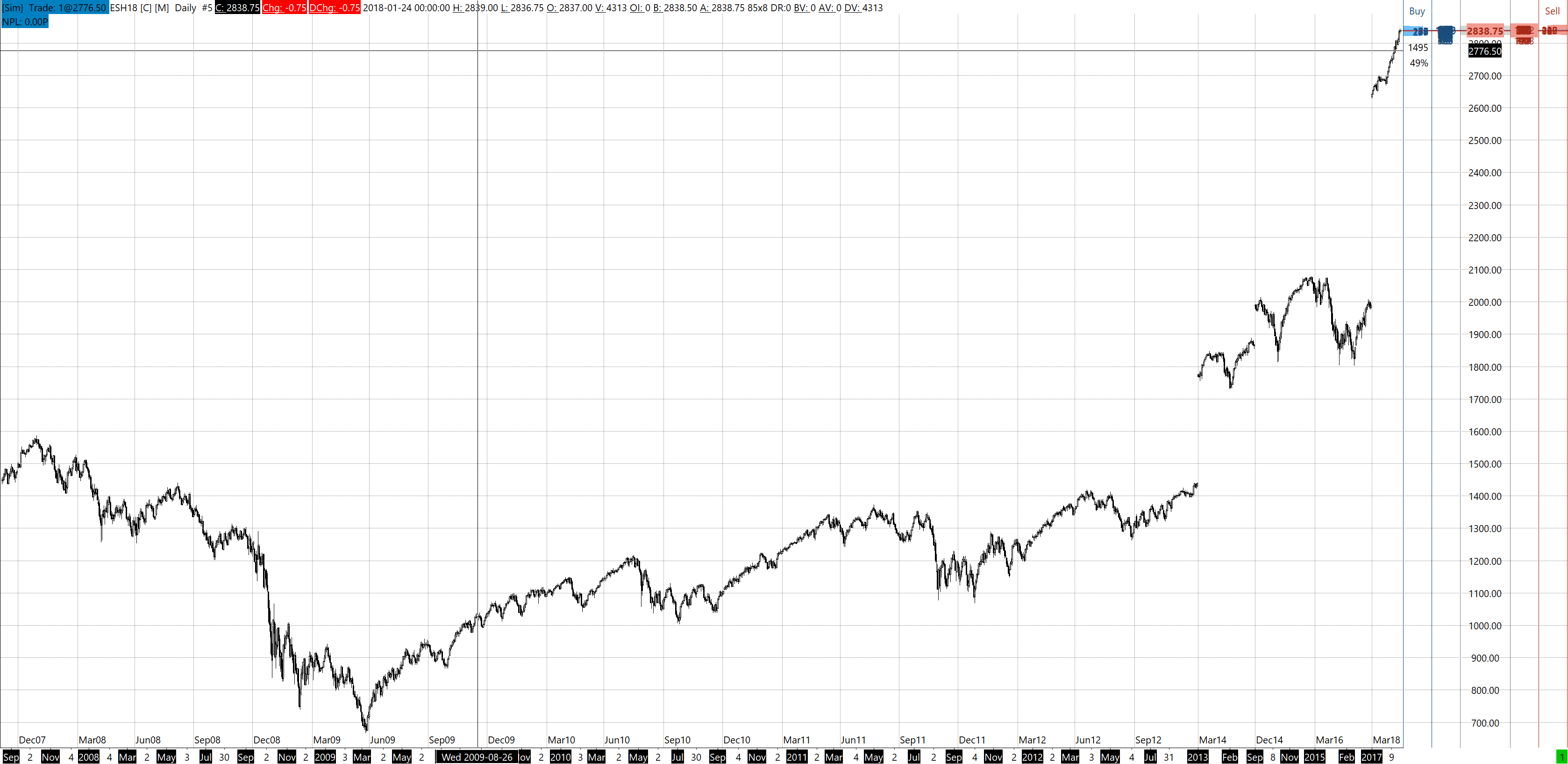 Hi. ES seems to be missing historical data. Chart is set up on 1D timeframe, continuous futures contract, automatic rollover with date rollover rule. I have also selected from the Edit menu, 'Delete All Data and Download'. Image link: http://www.sierrachart.com/image.php?Image=1516749345500.png Thanks Date Time Of Last Edit: 2018-01-23 23:19:58