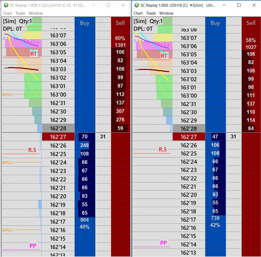 I saw in a similar post that you had provided the market depth files from the Sierra Chart data feed. I loaded up the files and put a CQG feed DOM (left) and a Sierra Chart feed DOM (right) side by side. As you can see, there is a large difference between the market depth figures being displayed, as shown in the pic attached below. This is not a time-stamp issue because the CQG feed depth figures are Never shown on the Sierra Chart feed DOM. Why is there such a large difference between them? Which one is correct? Also, both data feeds experience the same jumpiness and bid/ask spread issues. No efficiency improvement with the Sierra Chart data feed over the CQG feed during replay mode. Another indication that is is not a time-stamp issue. Date Time Of Last Edit: 2018-01-24 07:34:02